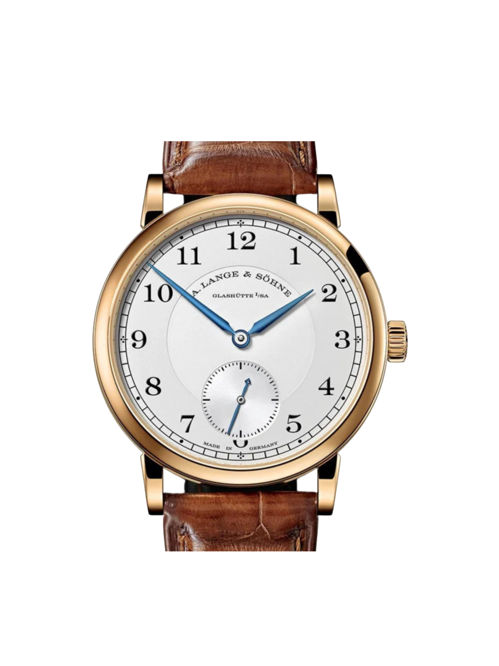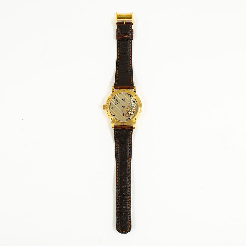 The white dial features classic Arabic numerals inspired by historic pocket watches. Blued steel hands provide sharp contrast and timeless legibility. A railroad-style minute track reinforces the watch’s traditional aesthetic and technical clarity. The balanced dial layout reflects Lange’s philosophy of symmetry and function.