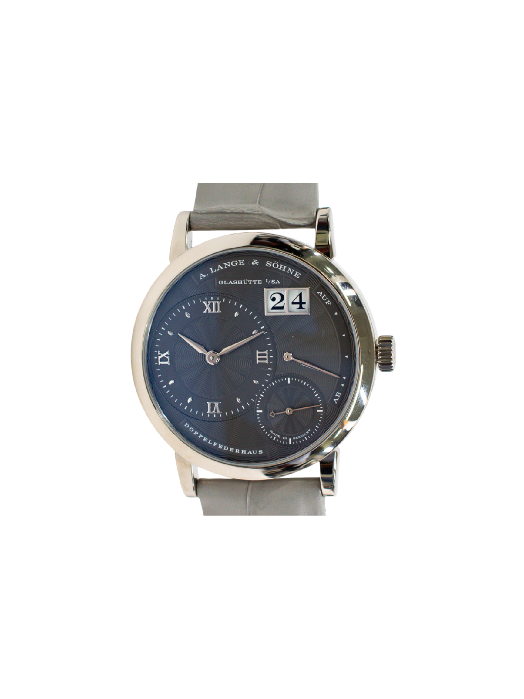 To begin with, the grey dial creates strong contrast and enhances every display. The signature off-center layout gives the watch a distinctive identity. Additionally, the oversized date window adds practical beauty and highlights Lange’s commitment to mechanical clarity. Hand-finished markers and hands elevate the overall elegance.
