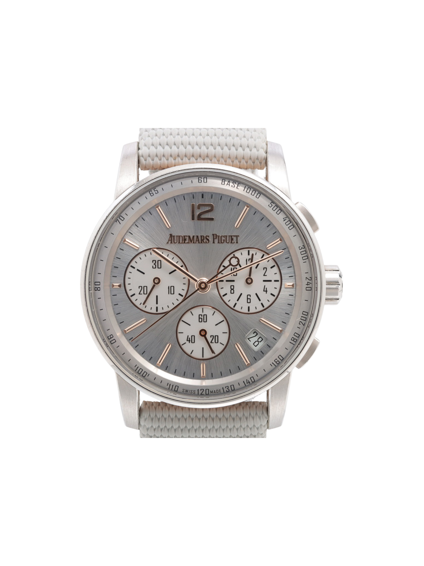 Audemars Piguet crafts the 41mm case from 18k white gold, combining a round bezel with an octagonal middle case. As a result, the watch offers visual complexity and elegant wrist presence. The grey dial features a textured pattern that creates dynamic light play. Applied white gold hour markers and luminous hands ensure excellent legibility. In addition, the flyback chronograph layout provides intuitive functionality and symmetry.
