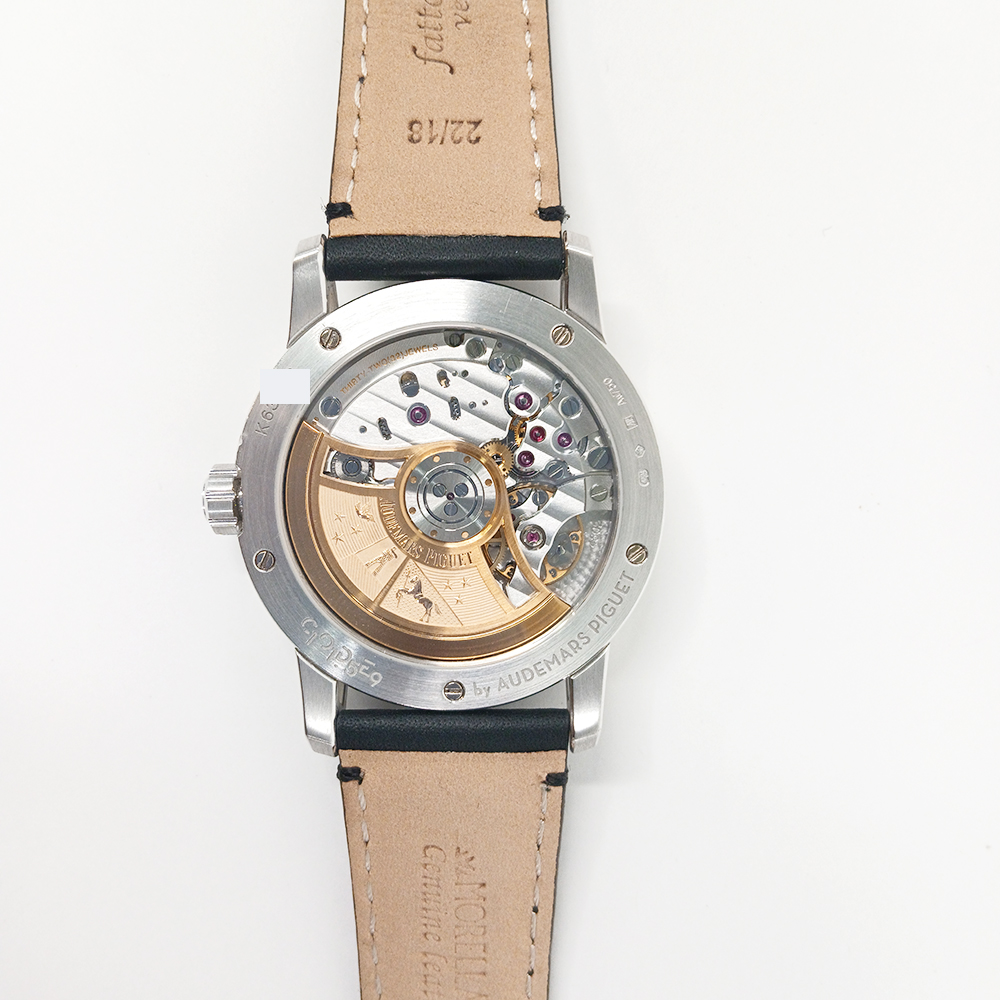 Inside, an in-house automatic movement delivers precision and reliability. Audemars Piguet finishes each component to exceptional standards. The hand-stitched blue strap completes the refined aesthetic.