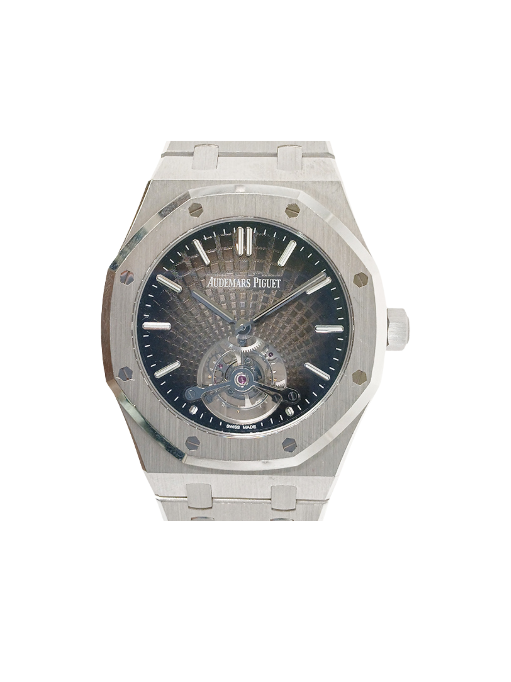 The 41mm case preserves the Royal Oak’s legendary octagonal bezel. Polished bevels contrast beautifully against the frosted surfaces. The grey dial enhances the watch’s contemporary character. Its clean layout balances elegance with strong visual depth. White gold hour markers and hands ensure clarity and refinement.
