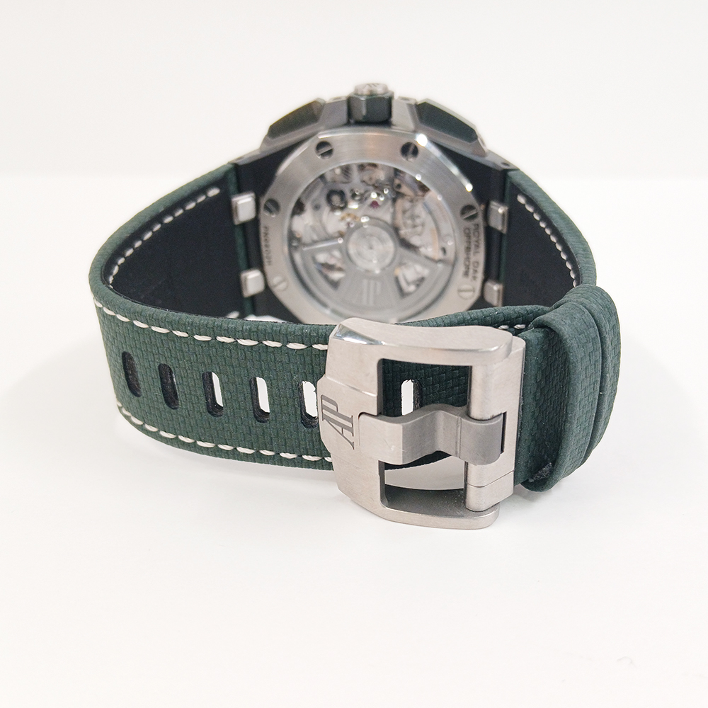 First, the watch features a 44 mm black ceramic case. This high‑tech material offers exceptional scratch resistance and a matte surface that feels both modern and purposeful. In addition, the green ceramic bezel with exposed screws reinforces the iconic Royal Oak Offshore identity. Together, these elements create a rugged yet refined design that makes a strong statement on the wrist.