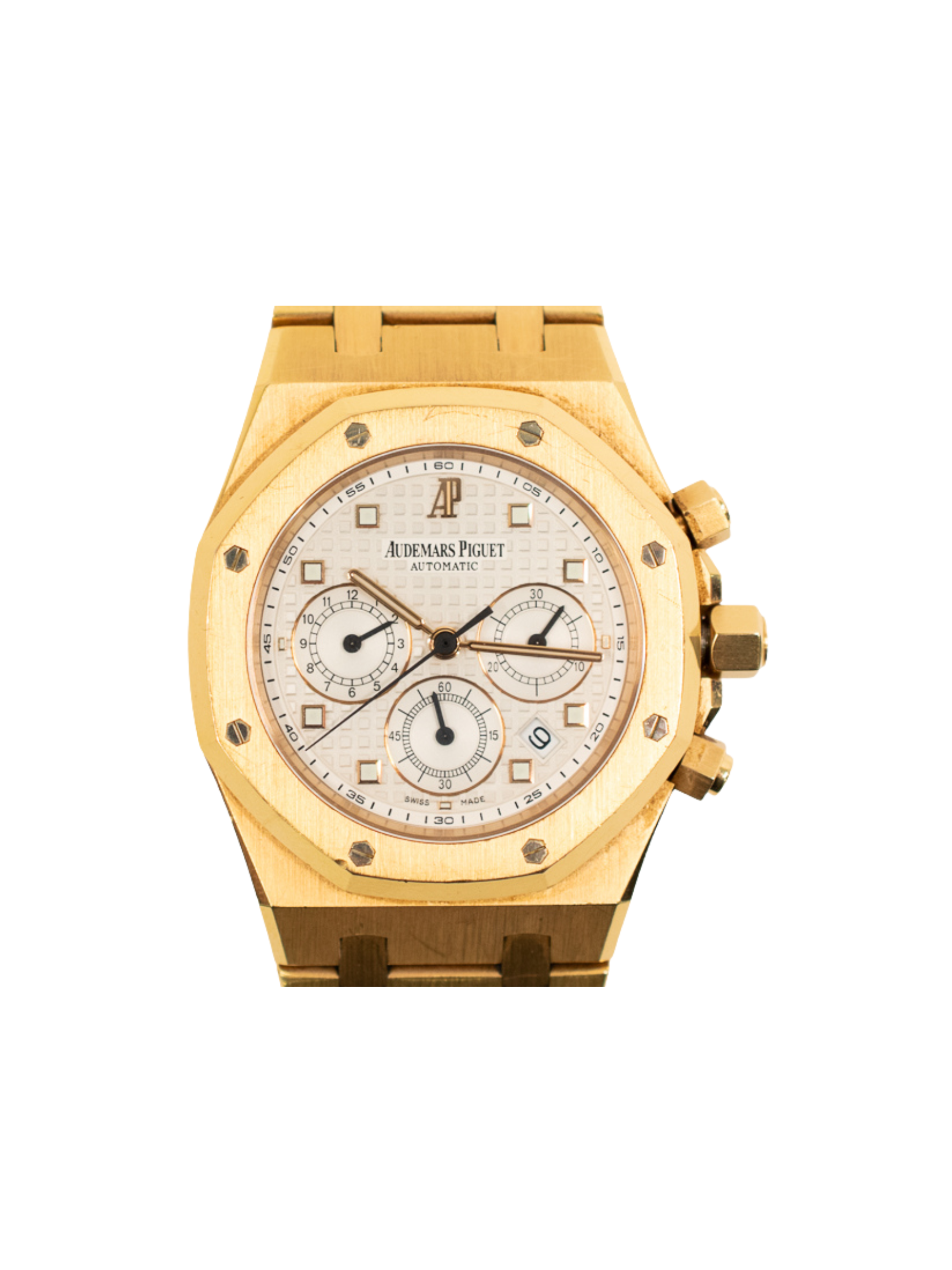 The integrated rose gold bracelet flows seamlessly into the case. Each link is hand-finished for comfort and visual refinement. Inside beats a high-performance automatic chronograph movement, engineered for precision and reliability. This model reflects Audemars Piguet’s mastery of complex watchmaking.