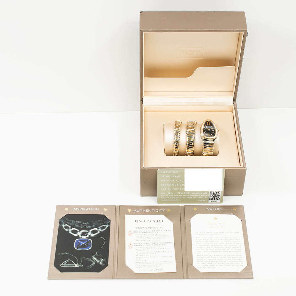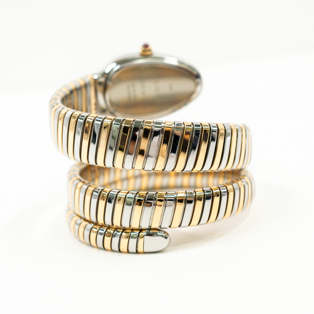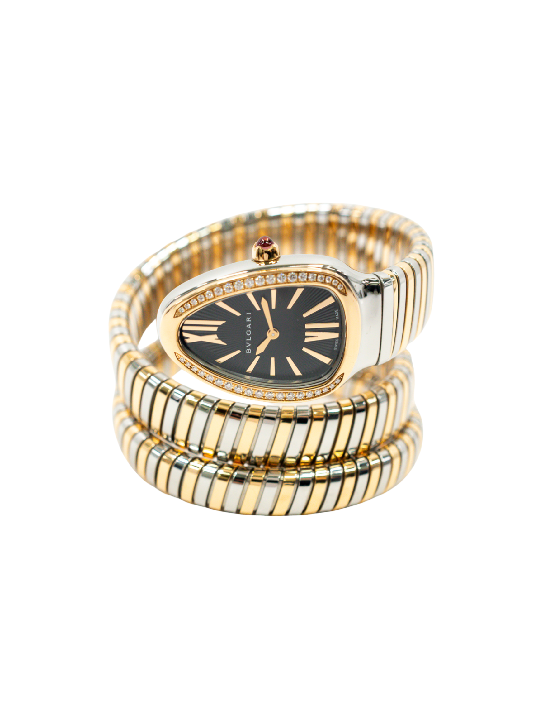 Its black lacquered dial adds striking contrast, highlighting Bulgari’s attention to refined detail and bold elegance. Surrounding the dial, a diamond-set bezel glimmers with brilliance, elevating the piece to pure sophistication. The supple, double-spiral bracelet wraps around the wrist with fluid motion, echoing the sinuous form of a serpent. Every element is handcrafted to perfection, ensuring comfort and opulence in equal measure.