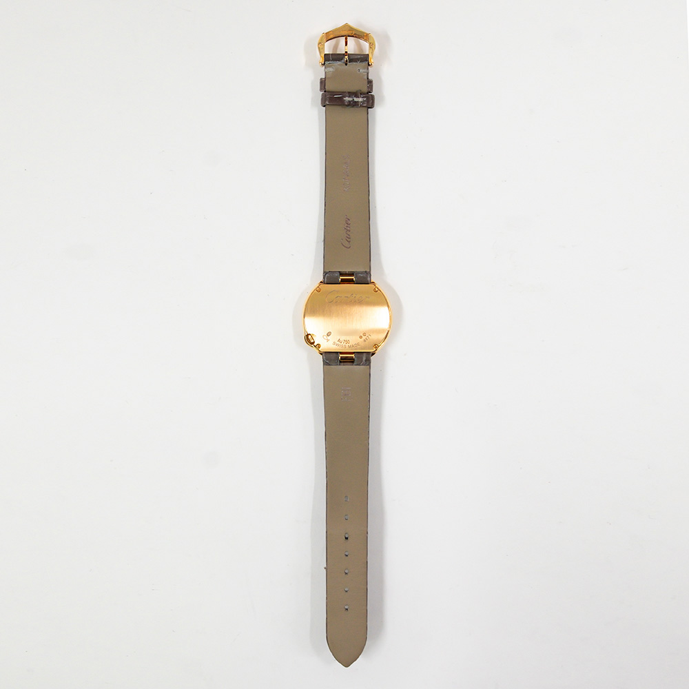 The Cartier features a beautifully polished 30mm round case, highlighted by a single brilliant-cut diamond set at four o’clock. This signature detail adds a delicate sparkle that enhances its graceful silhouette. The silvered guilloché dial displays bold black Roman numerals and blued steel hands, a signature of Cartier’s timeless design language.