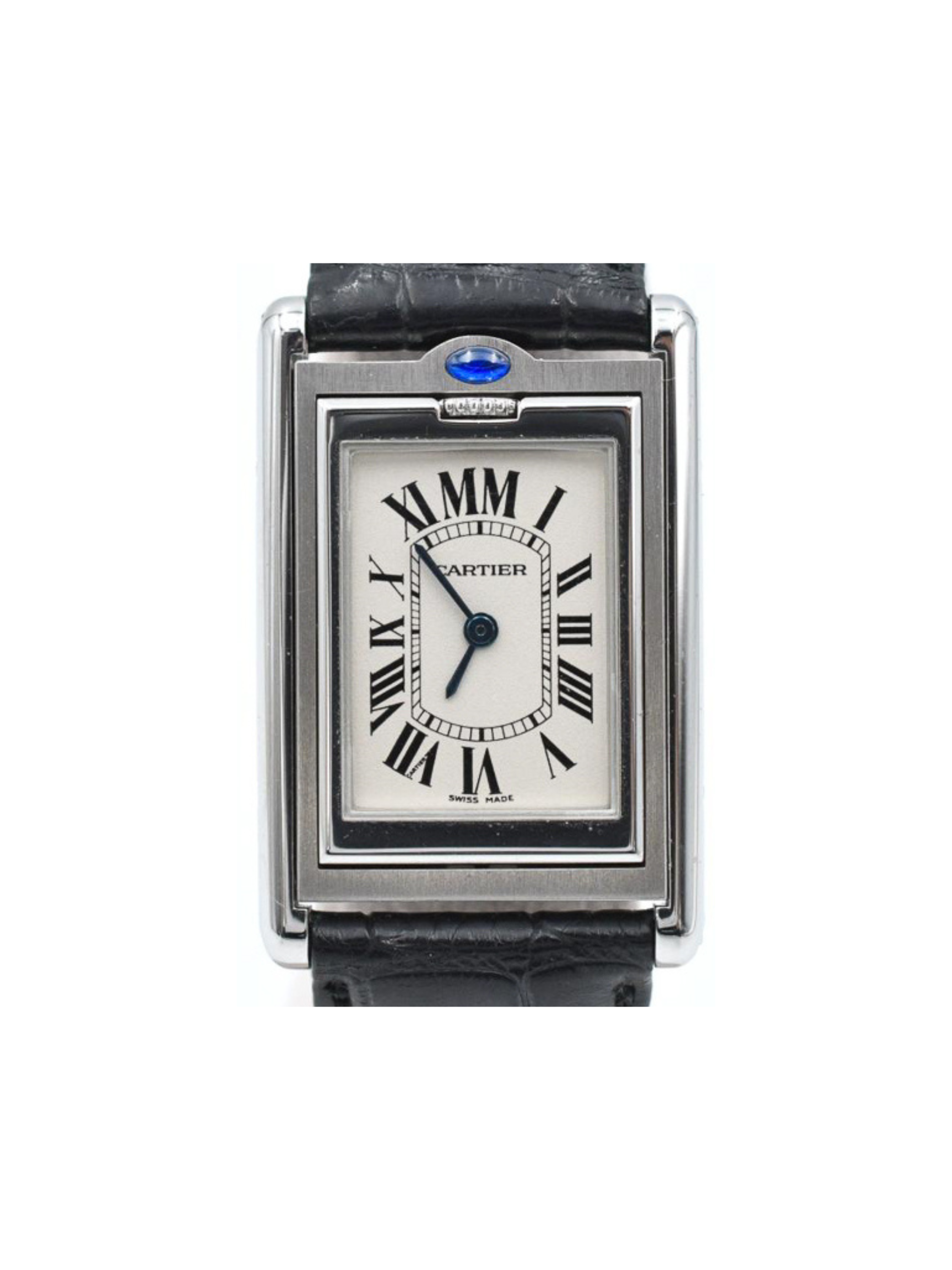 The Cartier Tank Basculante features a classic white dial with bold black Roman numerals. Blued steel sword-shaped hands enhance legibility and maintain Cartier’s signature aesthetic.