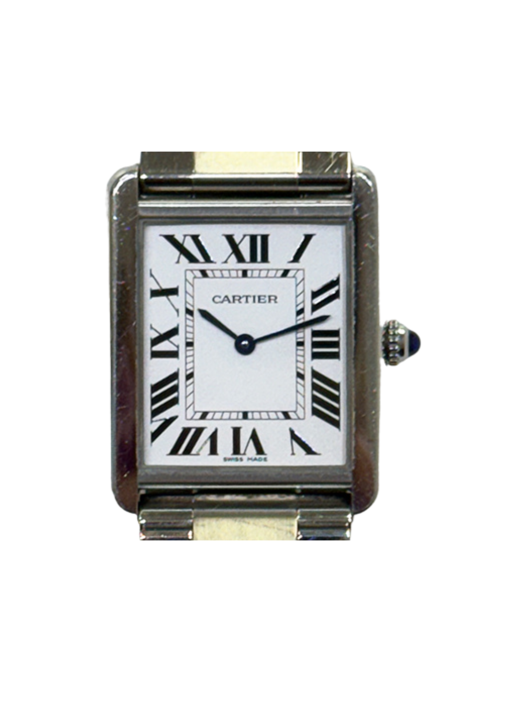 The stainless-steel case delivers both durability and refined appeal. It resists daily wear while preserving a polished finish. Meanwhile, the silver opaline dial enhances the watch’s sophisticated look. Bold black Roman numerals create strong contrast and improve readability. In addition, the blued steel sword-shaped hands add a signature Cartier touch. A sapphire crystal protects the dial and ensures lasting clarity.
