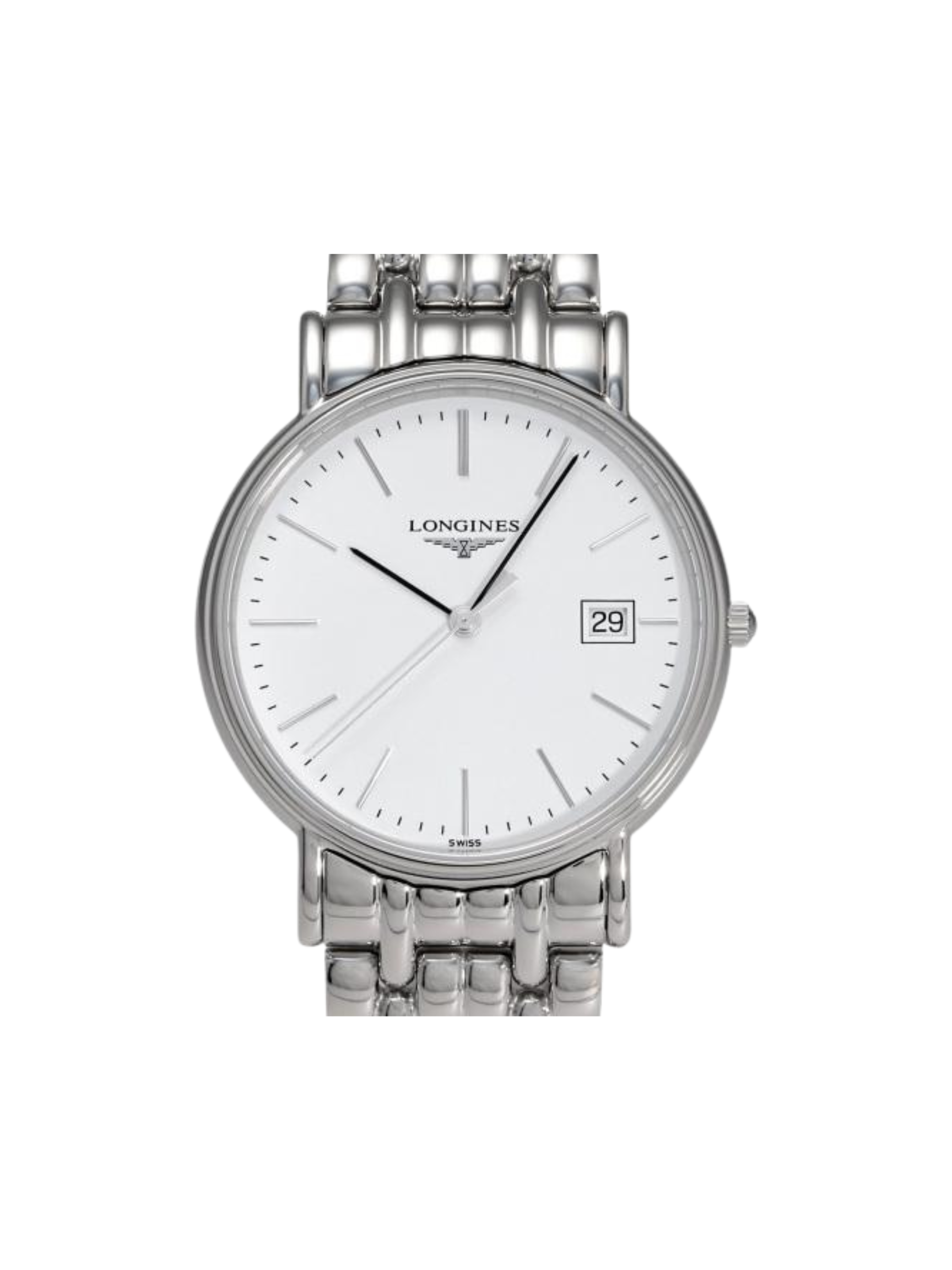 Its crisp white dial enhances readability and reflects Longines’ commitment to refined simplicity. Slim black hour markers and classic dauphine hands provide a sophisticated contrast and a discreet date window at 3 o’clock adds practicality without cluttering the dial.