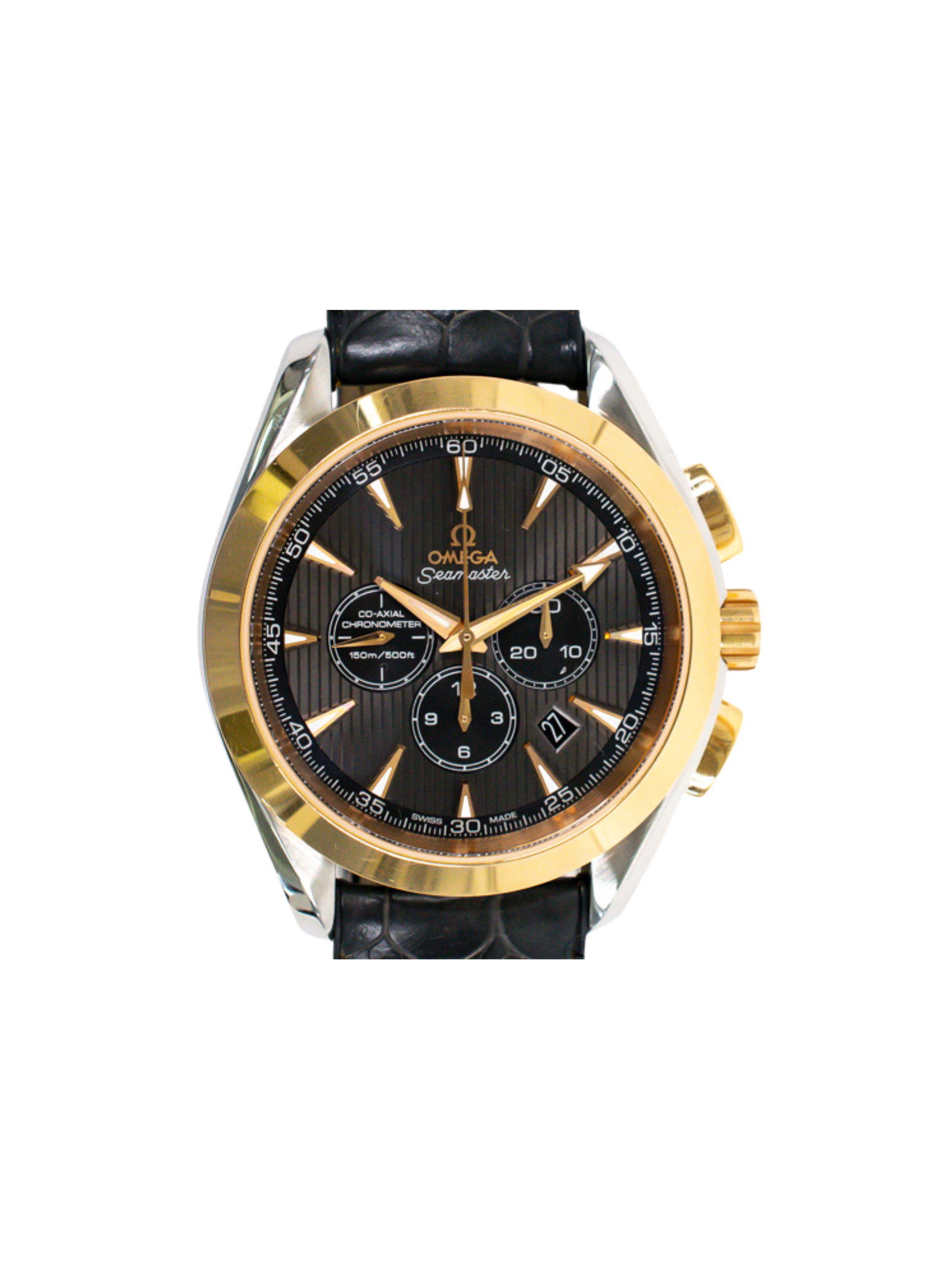 The Omega Seamaster Aqua Terra Chronograph Stainless Steel/Rose Gold with a Black Dial exemplifies Omega’s mastery in watchmaking. Crafted from polished stainless steel and 18k Sedna rose gold, it presents a refined two-tone aesthetic. The black dial features luminous hands and hour markers, ensuring excellent readability in all lighting conditions. A date window at 6 o’clock maintains a clean, balanced design.