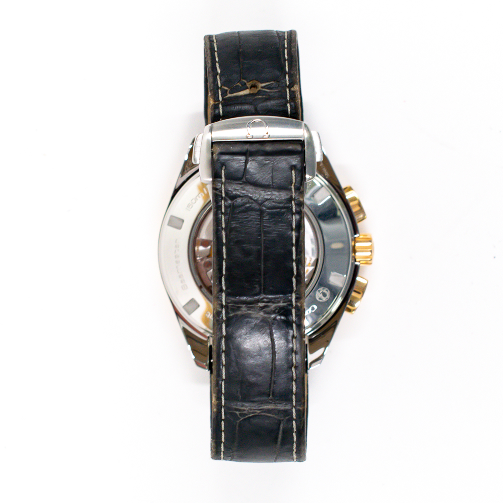 The chronograph function operates via pushers at 2 and 4 o’clock, allowing precise timing of events. A domed sapphire crystal protects the dial and resists scratches. The transparent case back reveals the intricate Omega Caliber 9901 automatic movement. METAS-certified, this movement delivers exceptional precision, anti-magnetic performance, and a 60-hour power reserve.