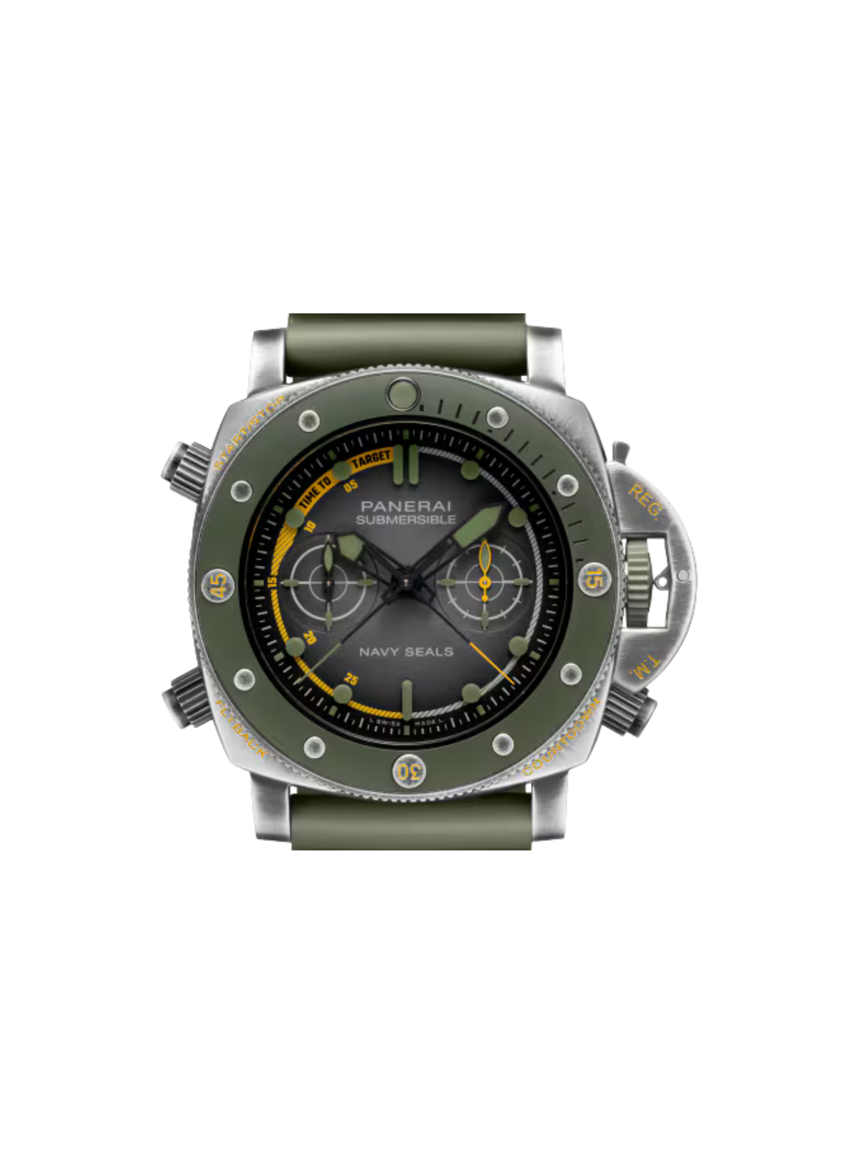 This model stands out for its unique Navy SEALs branding. The partnership gives the watch rare appeal and real historical depth. Collectors value this reference for its toughness and modern tactical style. The combination of steel, ceramic, and a stealth gray dial creates a bold presence on the wrist.