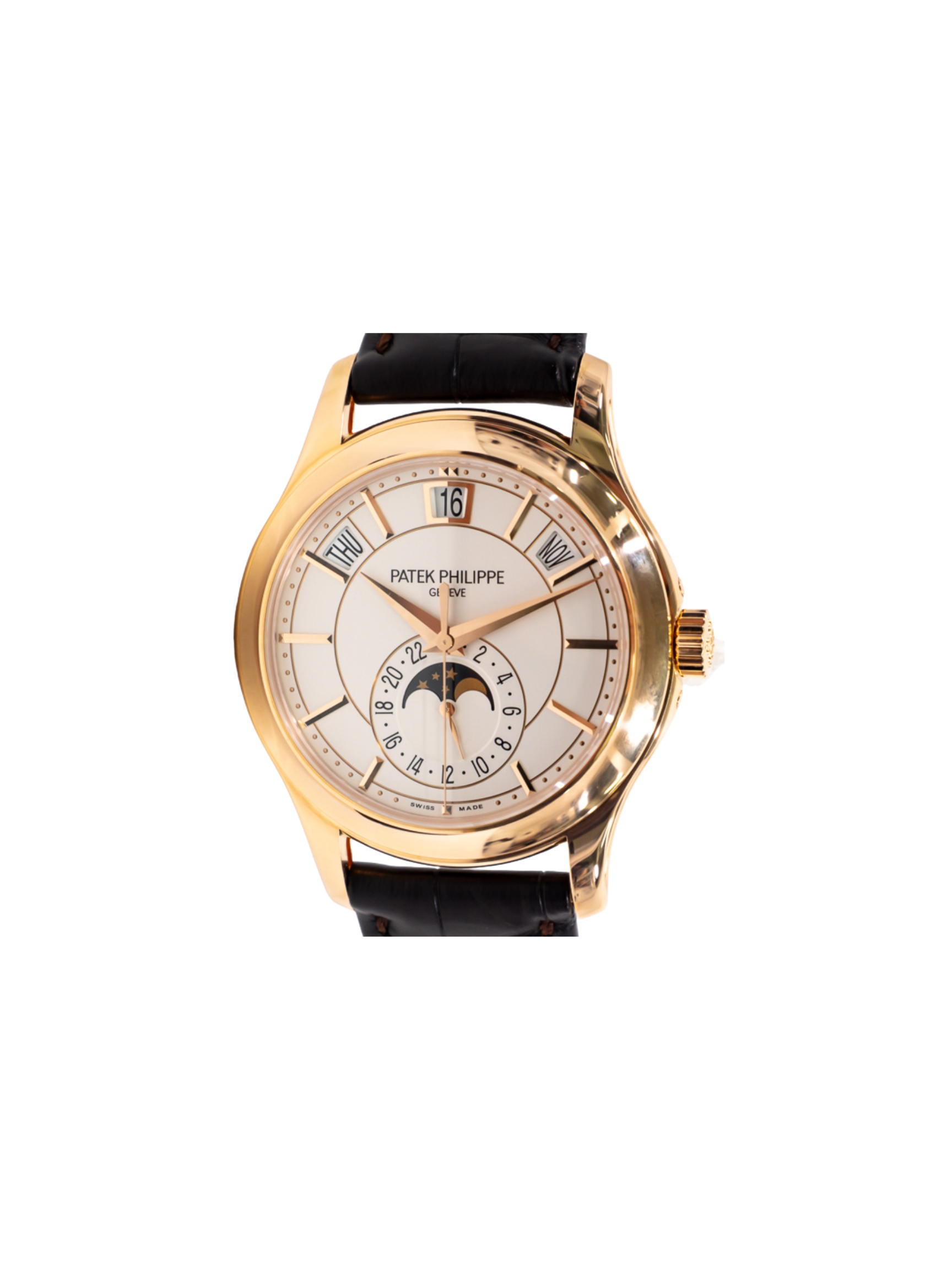 The white dial is accented with applied gold hour markers, offering clear readability and refined style. Its annual calendar function automatically differentiates between 30- and 31-day months, requiring adjustment only once per year. The moon phase display adds a poetic, classical touch, blending precision with aesthetic beauty.