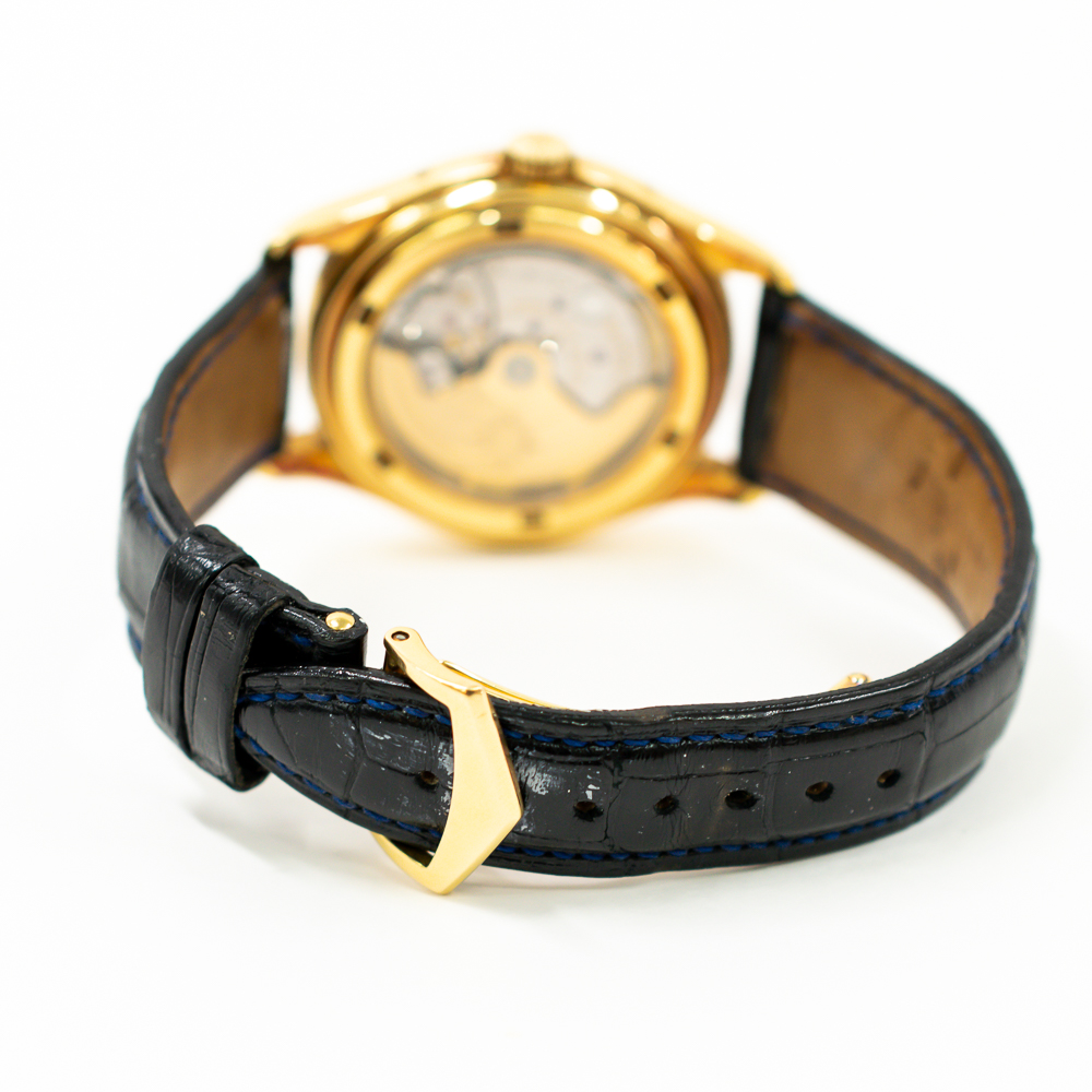 The watch requires adjustment only once a year, an engineering marvel that highlights the brand’s innovation. The luxurious brown alligator leather strap complements the golden tones, creating a harmonious and sophisticated aesthetic.
