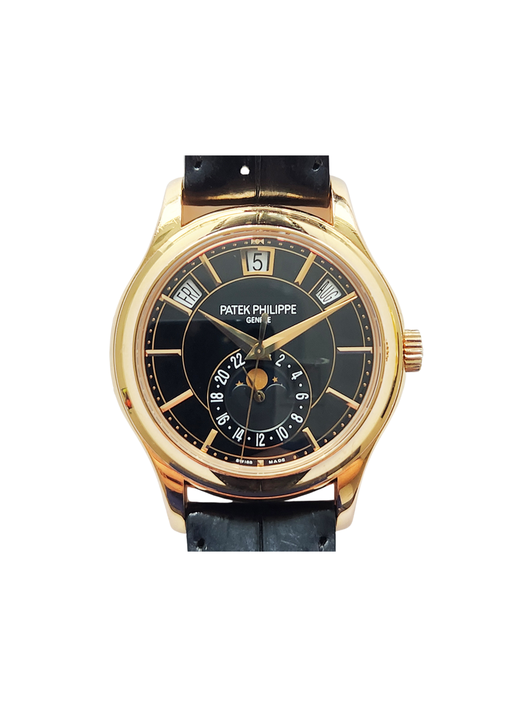 Patek Philippe crafts the 40mm case from solid 18k rose gold, giving the watch a rich and sophisticated presence. In addition, the concave bezel and sculpted lugs add architectural depth and contemporary flair. The black dial features applied rose gold stick hour markers, offering sharp contrast and exceptional legibility. The annual calendar apertures curve gracefully along the upper dial, creating a unique and instantly recognizable design.