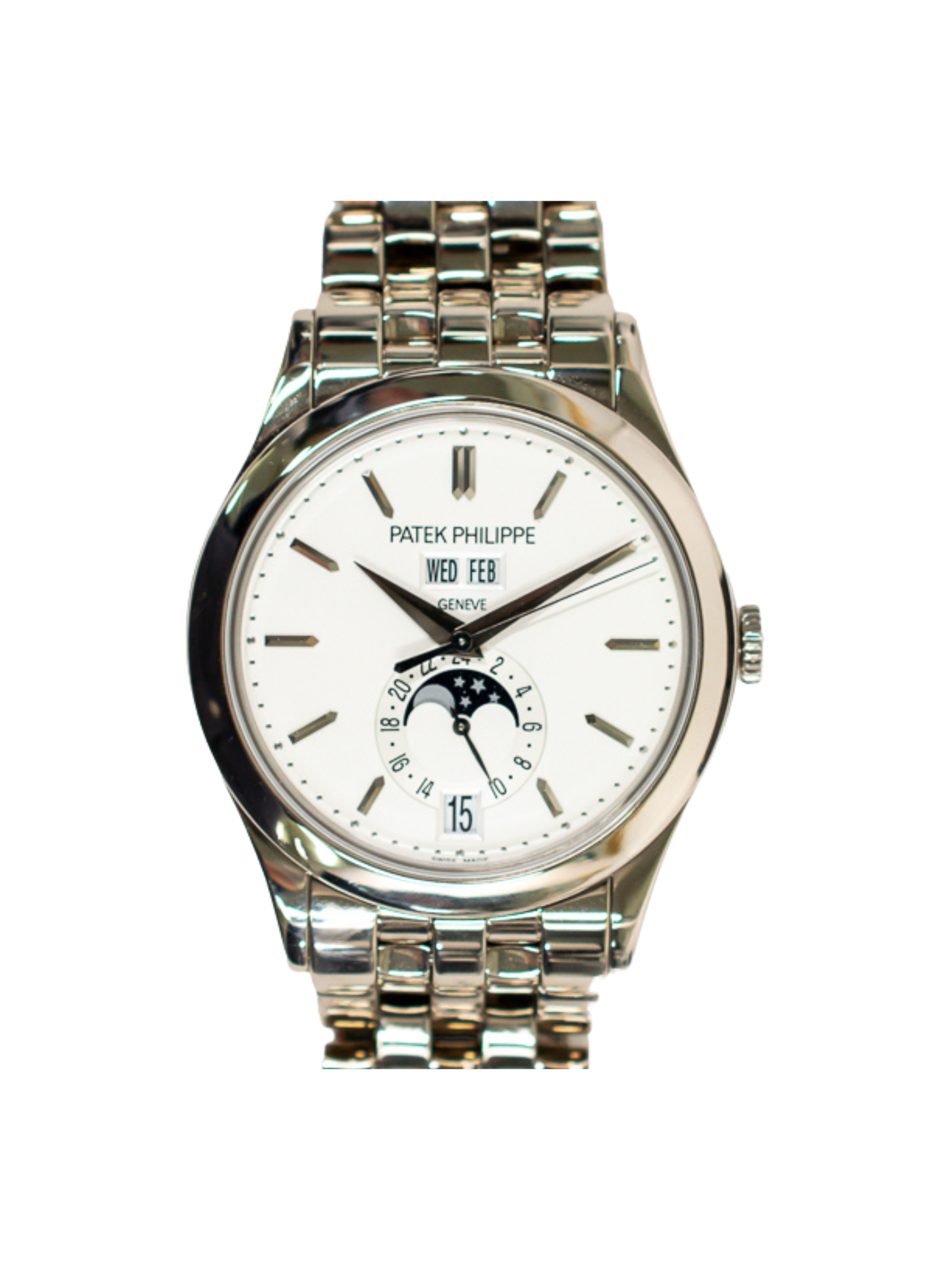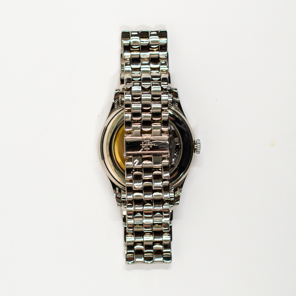 The watch features an 18k white gold case that offers a clean and sophisticated profile. Its integrated white gold bracelet adds balance and seamless flow. The crisp white dial enhances readability and reflects classic Patek aesthetics.