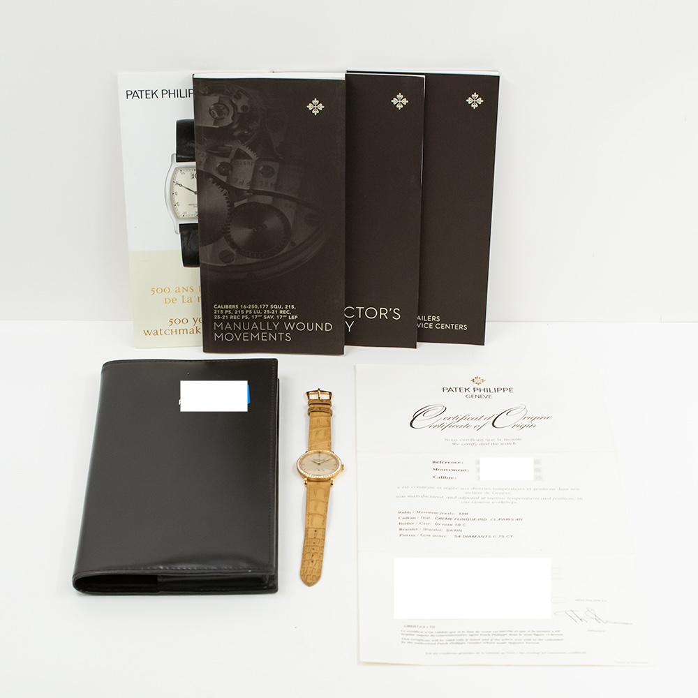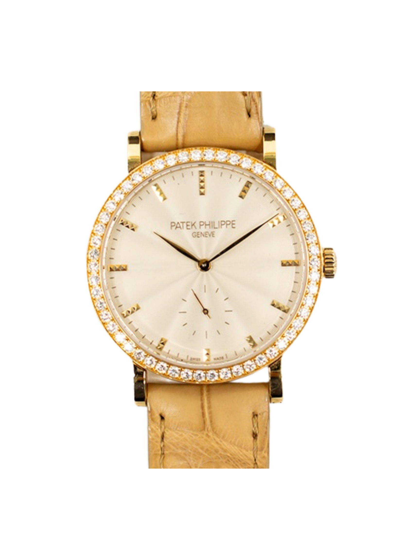 The Patek Philippe Calatrava Rose Gold Diamond Bezel with a Ivory Dial represents refined elegance and timeless craftsmanship. This exquisite ladies’ timepiece highlights Patek Philippe’s dedication to understated luxury and traditional watchmaking. The watch features a warm 18k rose gold case that delivers an elegant and feminine presence. Skilled artisans set brilliant-cut diamonds along the bezel, creating a radiant frame that elevates the watch’s classic silhouette.