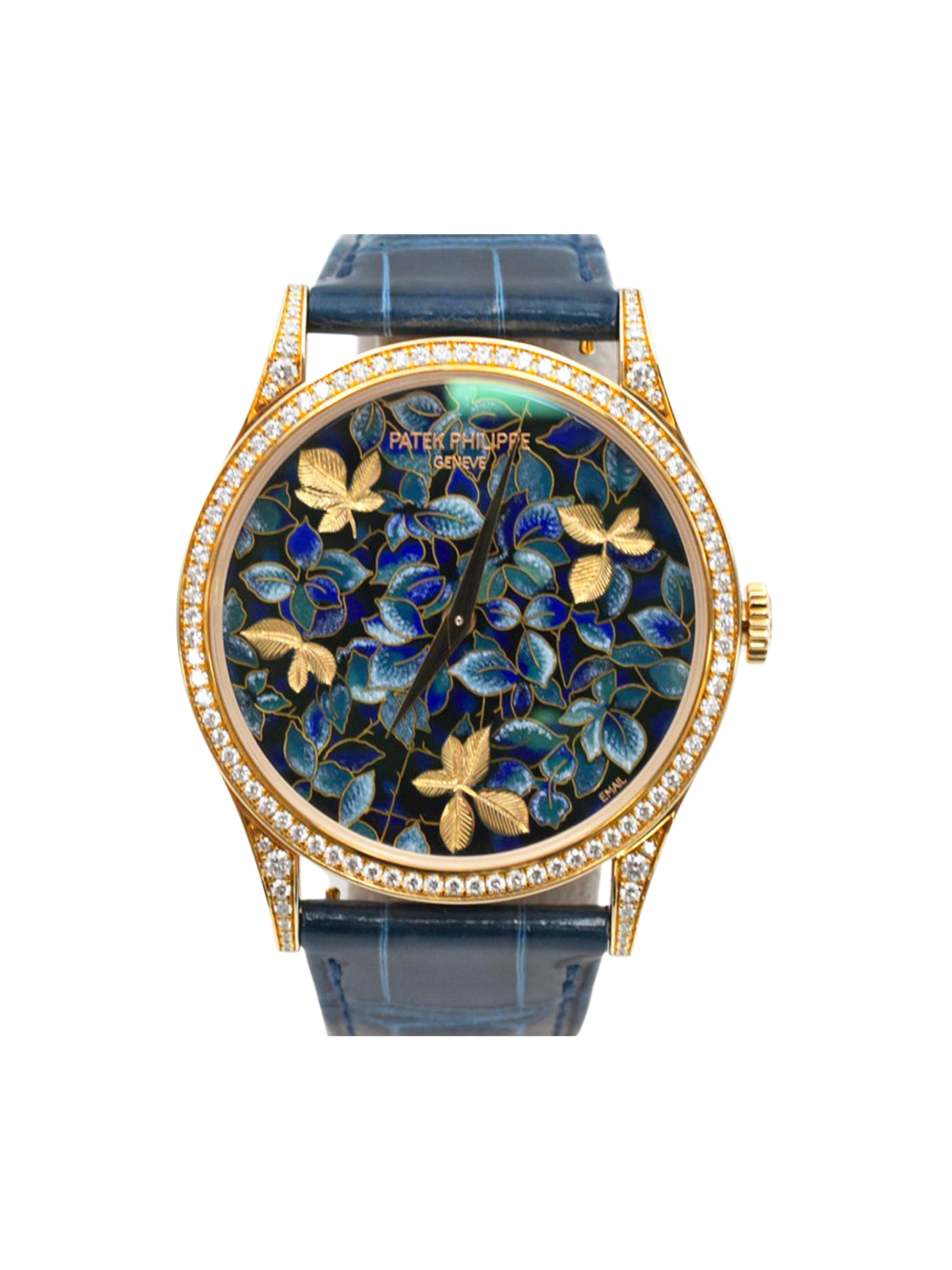 The Patek Philippe Calatrava Rose Gold Enamel Dial 5077/100R-032 is a breathtaking example of high horology and artistic craftsmanship. Its warm hue adds elegance and classic appeal. The real standout is the hand-made cloisonné enamel dial. It displays a vibrant bird and floral motif in vivid detail.