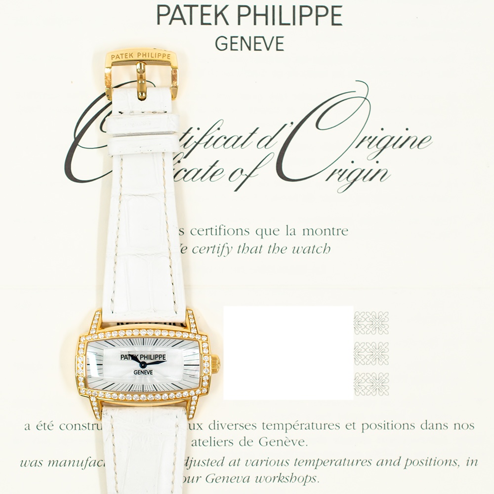 The 18k rose gold case features a sculpted tonneau design that enhances wrist presence. This warm metal contrasts beautifully with the shimmering mother-of-pearl dial. Patek Philippe accents the dial with brilliant diamonds that elevate its luxurious appeal. These diamonds frame the display with refined sparkle and exceptional craftsmanship.