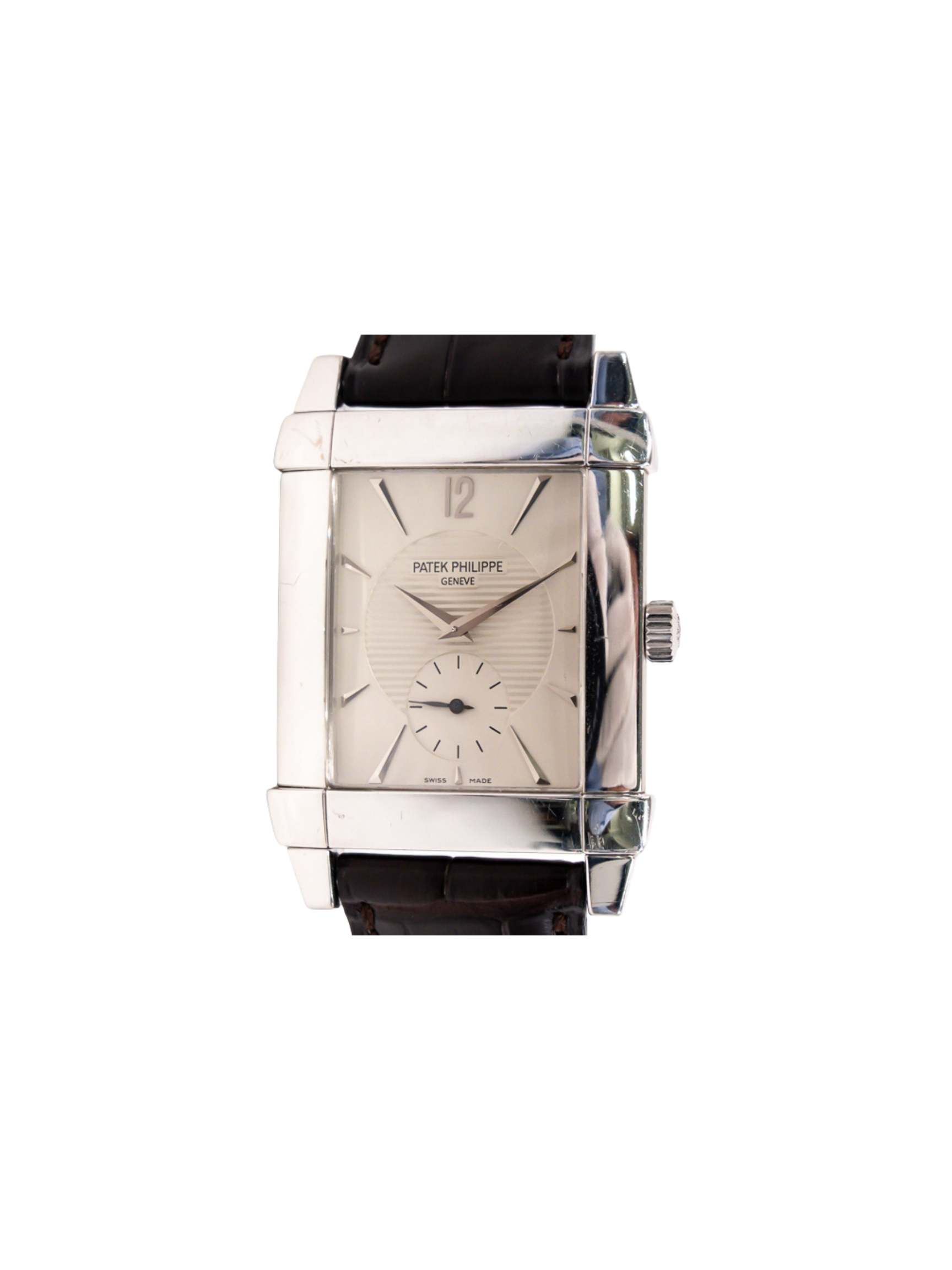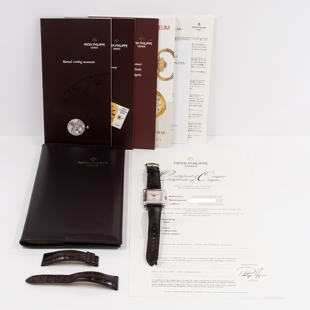 The Patek Philippe Gondolo White Gold with a Silver Dial is a distinguished timepiece renowned for elegance and precision. Crafted entirely from 18k white gold, it exudes luxury and sophistication. The rectangular case, a hallmark of the Gondolo collection, draws inspiration from the Art Deco movement of the 1920s. The silver dial features subtle guilloché patterns, adding depth and refined texture. Gold-applied hour markers and slim dauphine hands ensure precise readability.