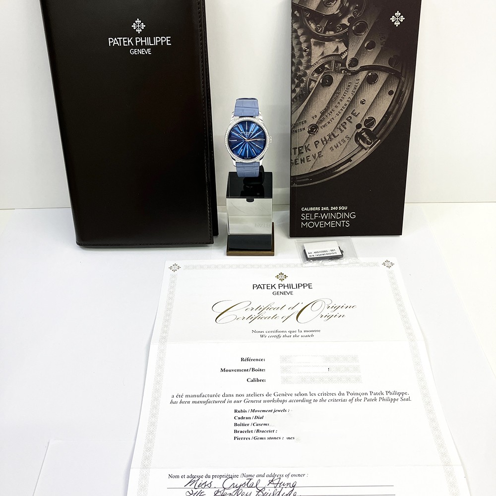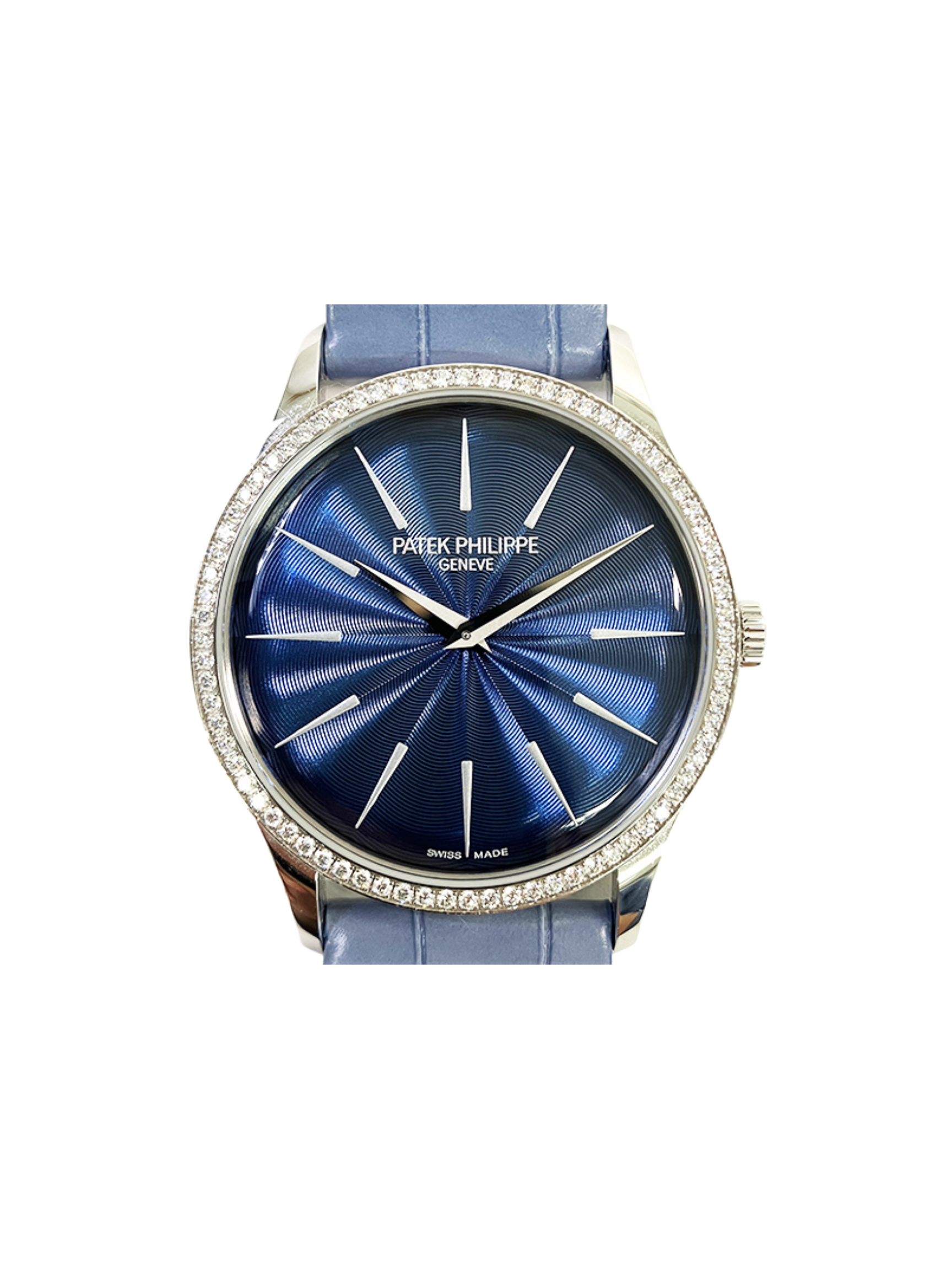 The Patek Philippe Ladies Calatrava Joaillerie White Gold with Blue Dial embodies refined elegance and exquisite craftsmanship. From the first glance, it captivates with its luxurious white gold case and vibrant blue dial. Moreover, it showcases Patek Philippe’s dedication to haute joaillerie and timeless watchmaking.