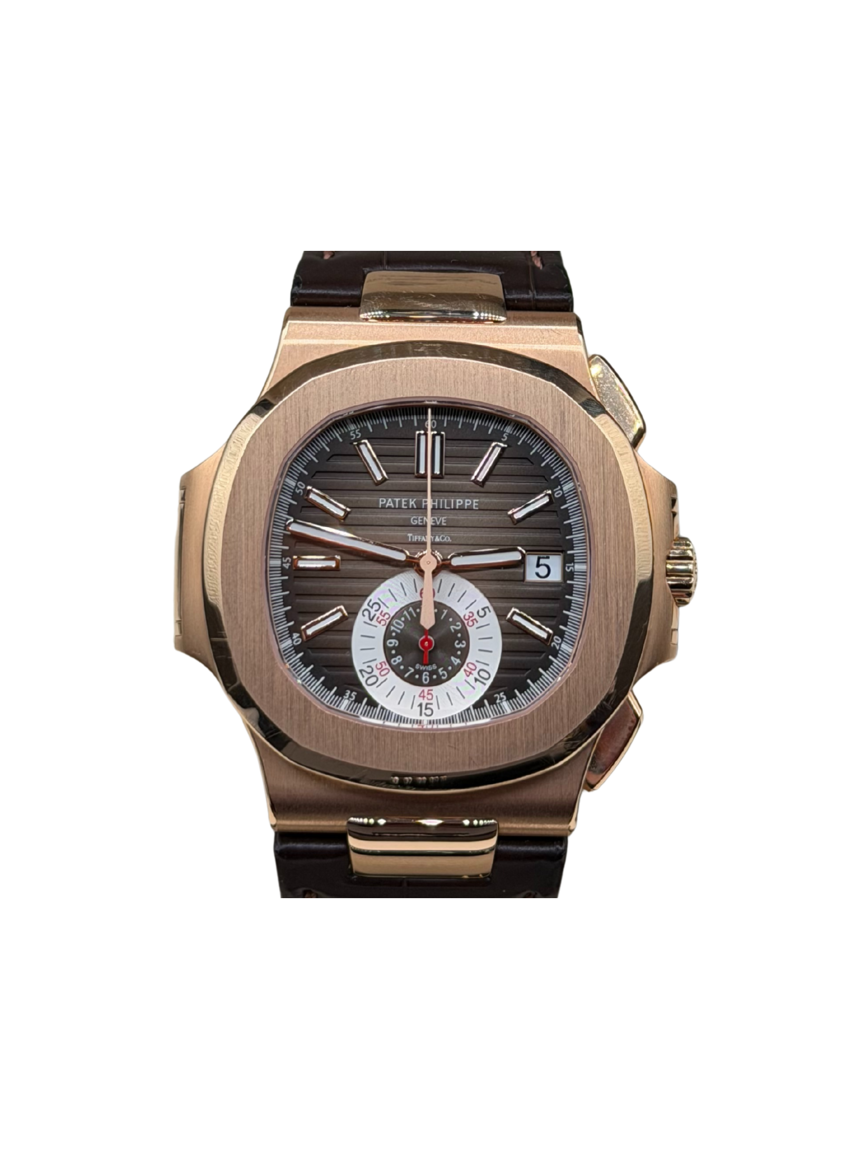 The Patek Philippe Nautilus Tiffany & Co 5980R-001 Rose Gold represents a remarkable fusion of rarity, craftsmanship, and timeless style. Moreover, its 18k rose gold case creates a warm and elegant presence on the wrist. The iconic Nautilus design features bold contours, which further enhance its luxurious personality. In addition, the rich brown leather strap offers classic sophistication and exceptional comfort, perfectly complementing the warm tones of the rose gold case.