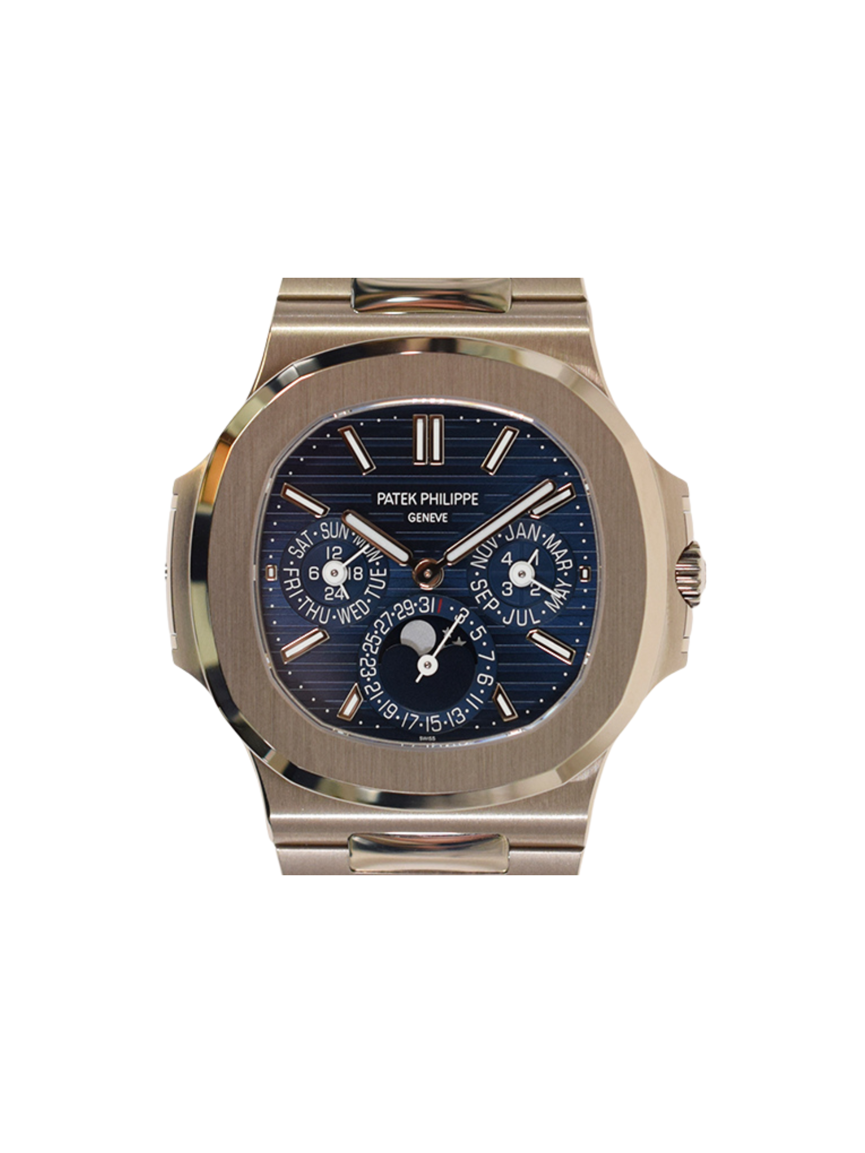 The watch holds historical importance as the first perpetual calendar in the Nautilus collection. This innovation elevated the model into an elite category of haute horology.