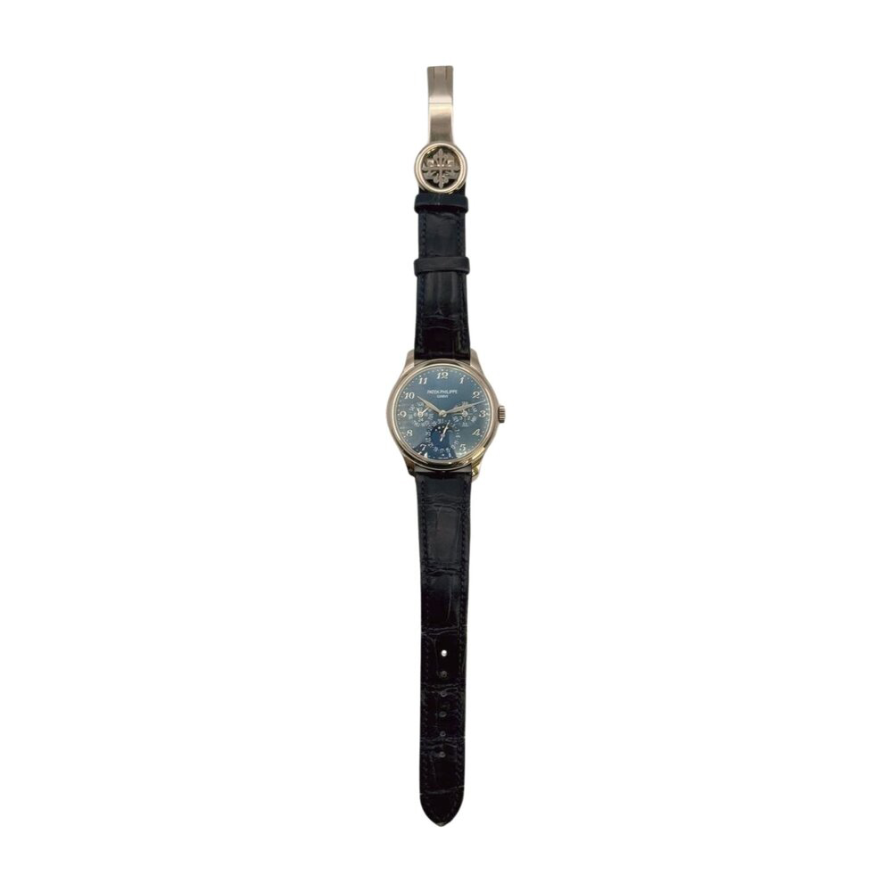 The 39 mm case is crafted from solid 18k white gold, offering a polished and elegant look. Its slim profile sits comfortably on the wrist. In addition, the deep blue dial draws immediate attention with bold Arabic numerals. Leaf-shaped hands enhance the traditional style, while the balanced sub-dials display the calendar functions with clarity.