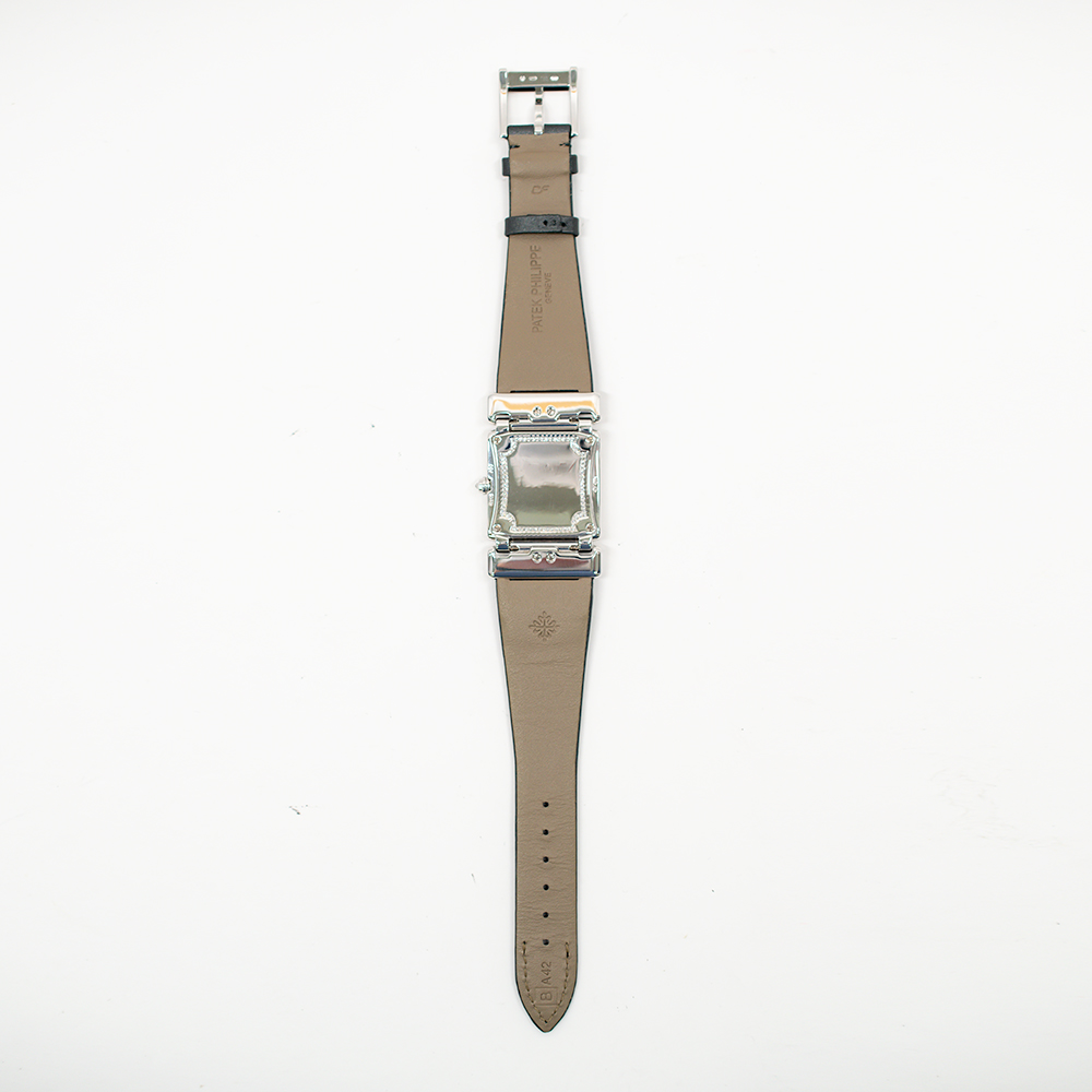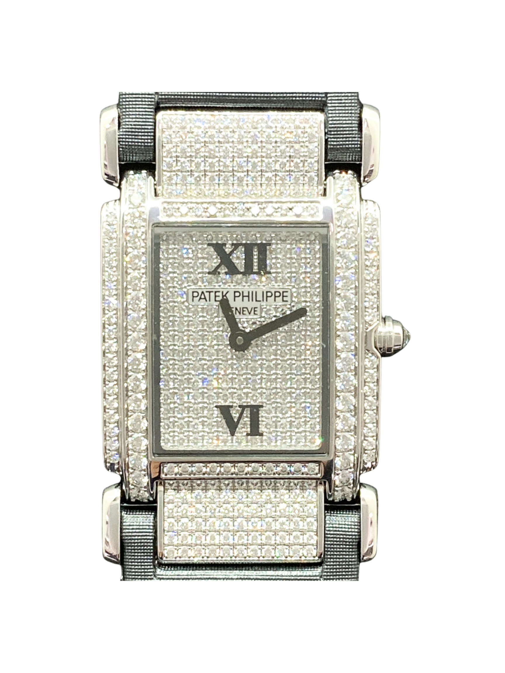 The watch features a breathtaking pave diamond dial, meticulously set with hundreds of brilliant-cut diamonds that shimmer from every angle. Surrounding the dial, the white gold diamond bezel enhances the brilliance, creating a seamless cascade of light. Each diamond is expertly matched for clarity and size, reflecting Patek Philippe’s uncompromising attention to detail.