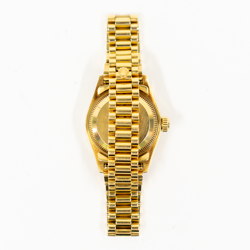 Inside, the self-winding automatic movement ensures precision and reliability. The classic Cyclops lens magnifies the date for effortless readability, a hallmark of Rolex innovation. The President bracelet, also crafted from 18k yellow gold, provides exceptional comfort and a seamless finish.