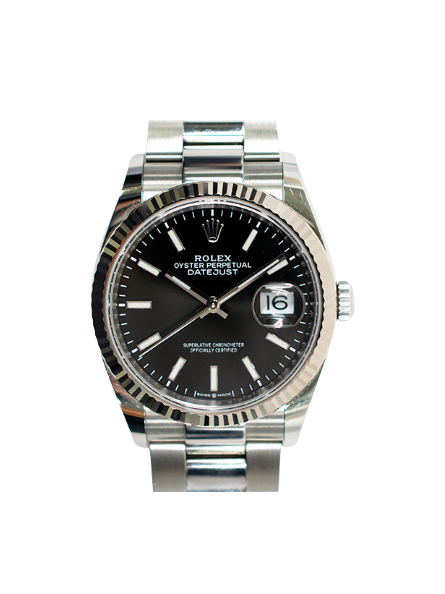 The watch features a classic 36mm case crafted from Oystersteel. This alloy delivers exceptional strength and a brilliant finish. Its white gold fluted bezel adds a striking touch that enhances the watch’s visual depth. The bold black dial creates powerful contrast and ensures clean, easy readability. Luminous markers and polished hands improve visibility in all lighting conditions.