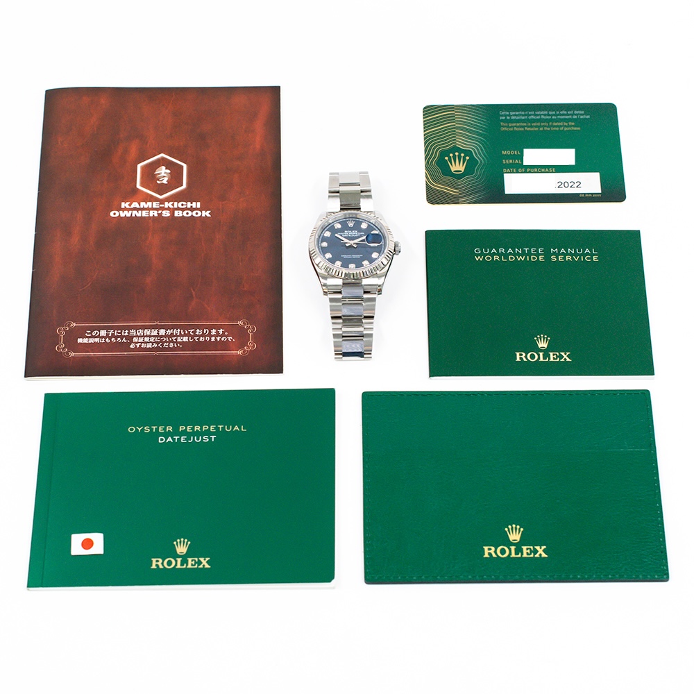 Crafted from Oystersteel and 18k white gold, the watch exudes durability and luxury. The polished white gold fluted bezel catches the light beautifully, enhancing its unmistakable Rolex allure. The deep blue dial is adorned with brilliant-cut diamond hour markers, offering a touch of glamour that remains understated and tasteful.