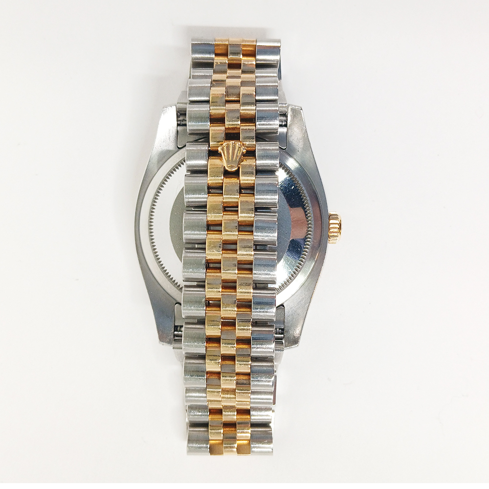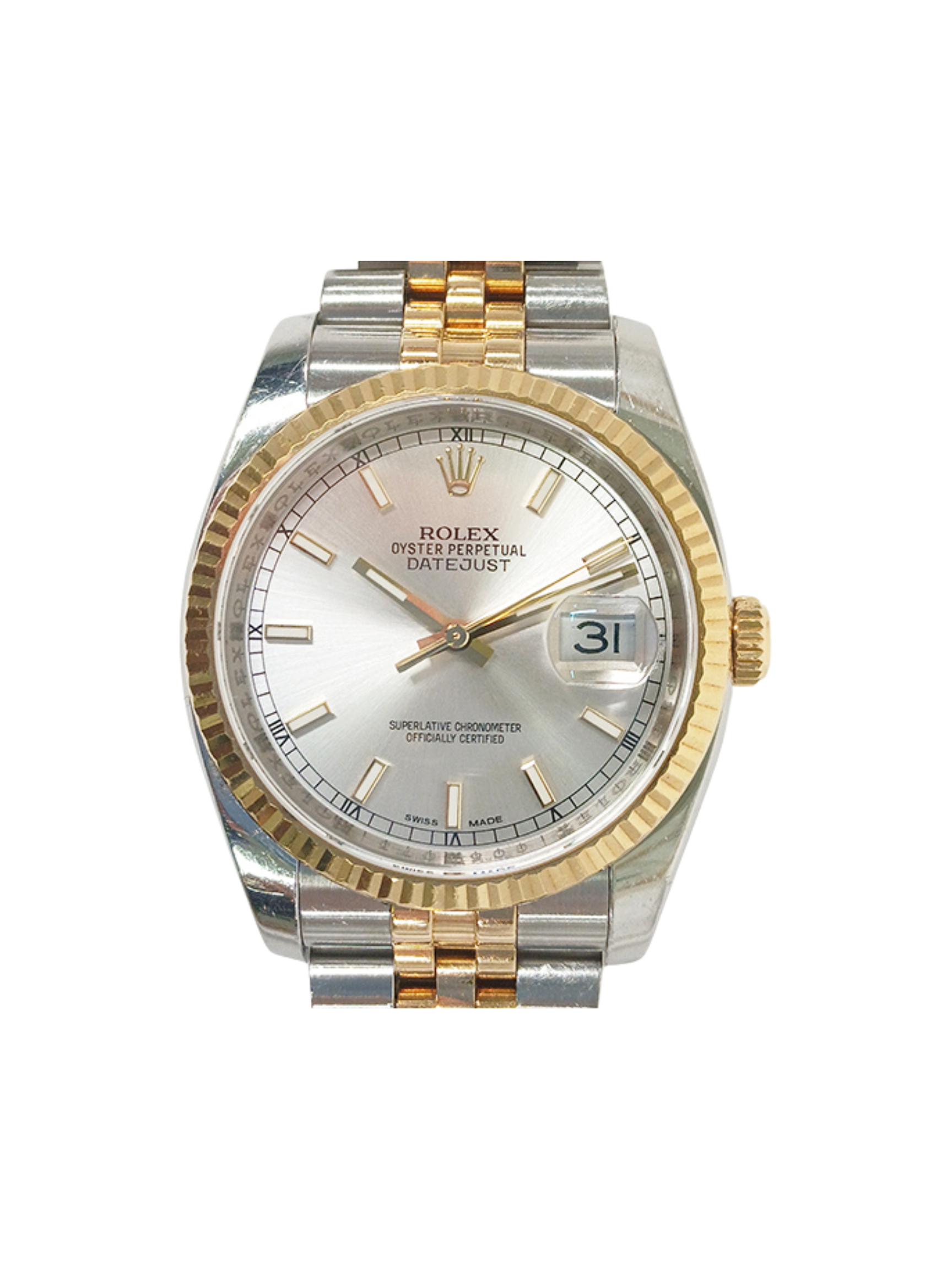 The 36mm case blends Oystersteel and 18k yellow gold for strength and elegance. The iconic fluted yellow gold bezel adds depth and unmistakable Rolex character. Its silver stick dial delivers a clean, balanced aesthetic. Slim baton hour markers enhance legibility while preserving a minimalist look. The Cyclops lens magnifies the date for instant readability.