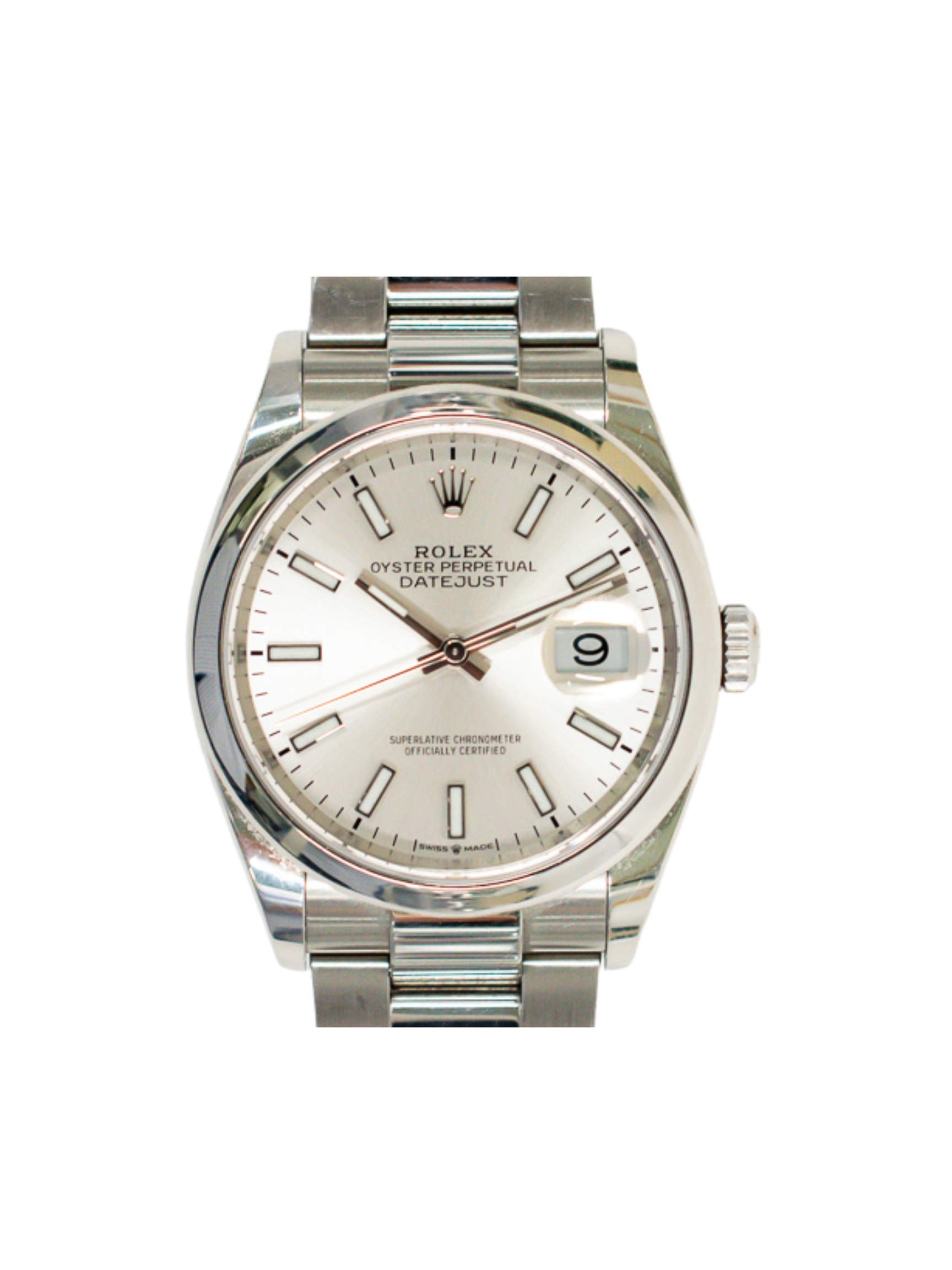 The 36mm Oyster case offers exceptional comfort and universal appeal. Its stainless steel construction delivers impressive strength and a brilliant polished finish. The smooth domed bezel adds a sleek profile that enhances the watch’s understated luxury. This detail highlights the purity of the Datejust’s iconic design language. The silver sunray dial creates a soft radiance that shifts beautifully in changing light.