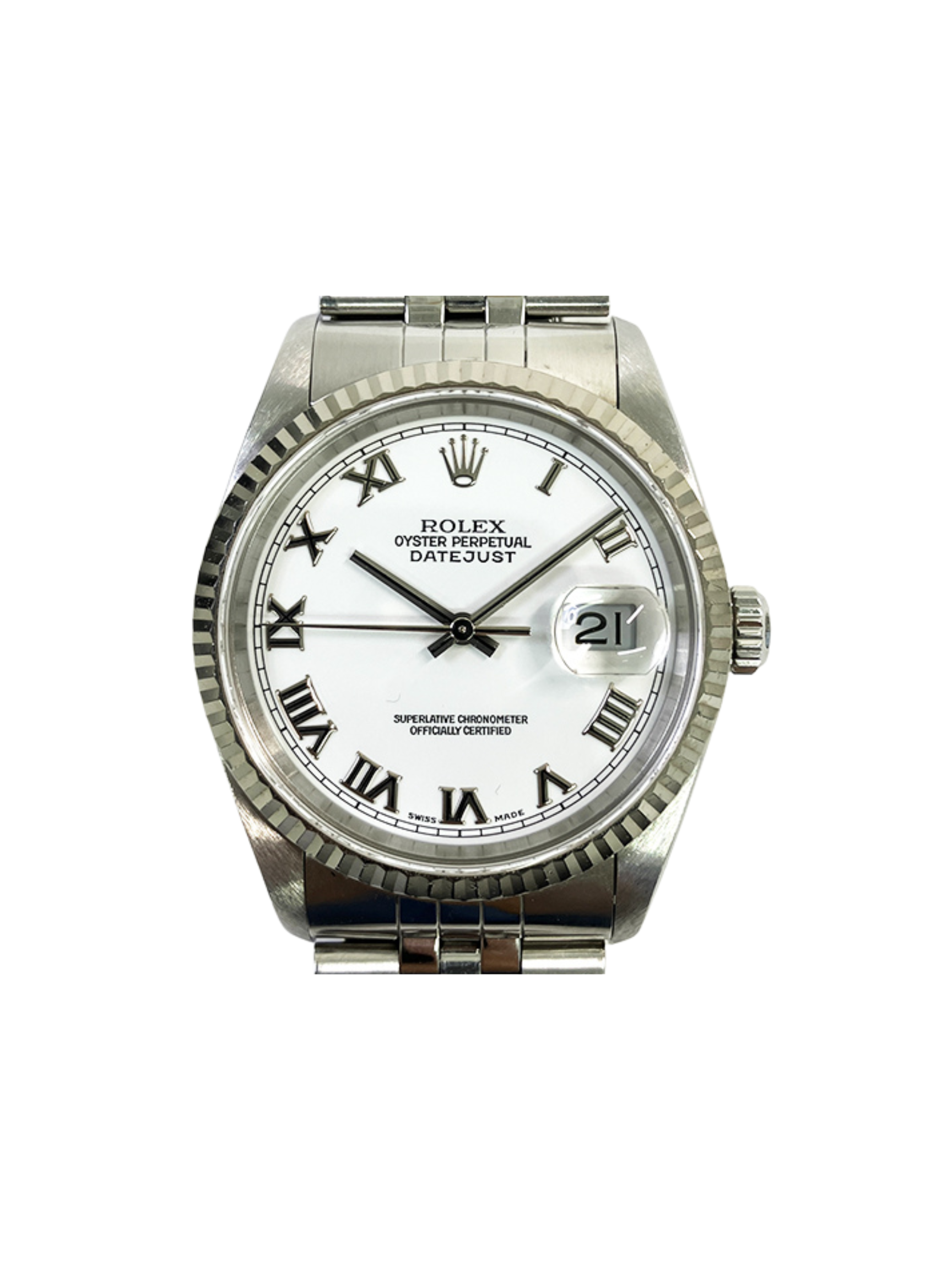 Rolex crafts the 36mm Oyster case from corrosion-resistant stainless steel, complemented by an 18k white gold fluted bezel. As a result, the watch offers durability, balanced proportions, and a touch of luxury. The crisp white dial features black Roman numerals and polished hands for clear legibility. In addition, the date window at three o’clock is enhanced by the signature Cyclops lens for quick, easy reading.