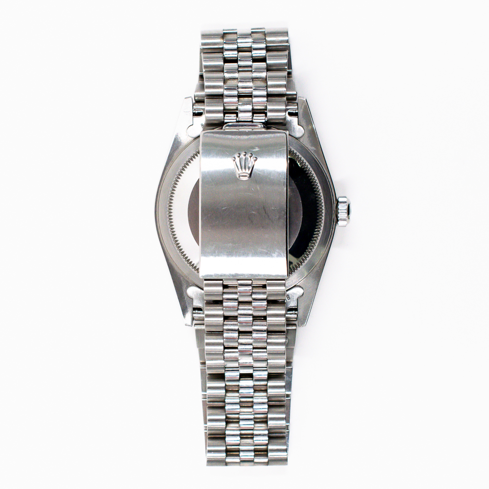 A 36mm Oyster case was designed for balanced proportions and versatile wear. The white dial, enhanced with Roman numerals, is recognized for its refined and sophisticated appearance. Luminous hands were applied for subtle visibility in low-light conditions. The iconic date window, located at 3 o’clock, is magnified by the Cyclops lens for effortless readability.