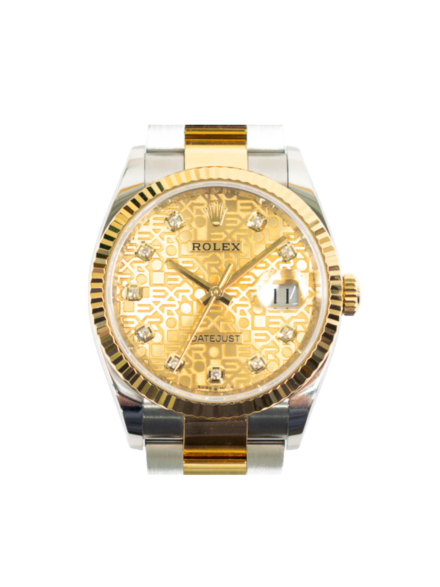 The 36mm Oyster case blends durable Oystersteel with luxurious 18k yellow gold. The fluted yellow gold bezel reflects light beautifully, adding depth and unmistakable Rolex character. Its champagne dial delivers a warm, classic tone enhanced by diamond hour markers. Each diamond adds brilliance while maintaining refined restraint.