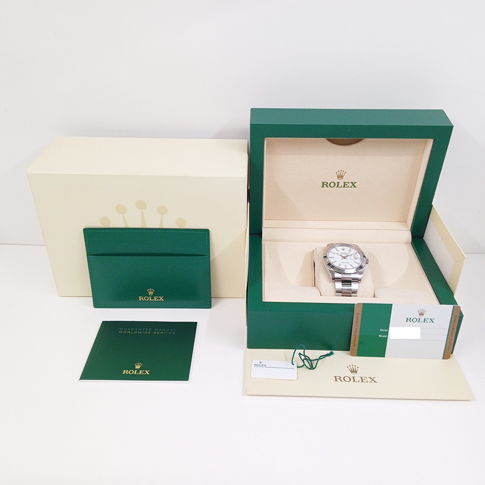 The crisp white dial features sleek stick hour markers and luminous hands for excellent readability in any light. A Cyclops lens over the date window enhances visibility while preserving Rolex’s signature aesthetic. Powered by the Rolex Caliber 3235 automatic movement, this watch guarantees precise timekeeping and a 70-hour power reserve.