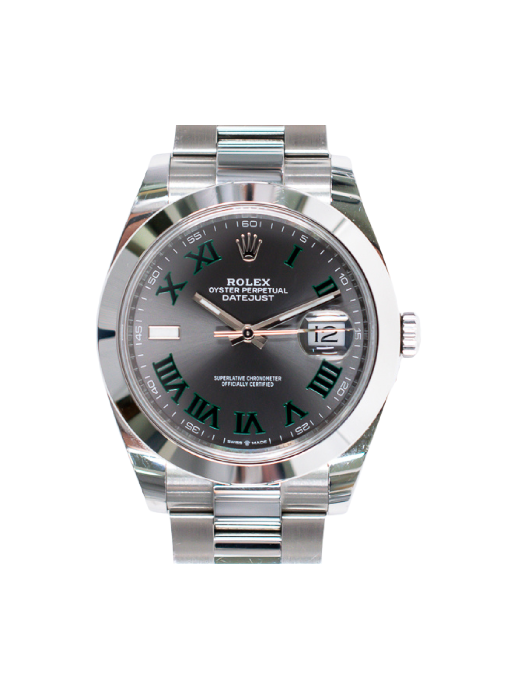 The Rolex Datejust 41 Stainless Steel with a Wimbledon Roman Dial is a masterpiece of timeless sophistication and modern precision. Crafted from robust Oystersteel, this 41mm model showcases Rolex’s dedication to elegance and durability. Its signature Wimbledon dial—a slate gray face accented by green Roman numerals—creates an unmistakable and refined aesthetic. Each numeral is edged in black, offering sharp contrast and exceptional legibility in any light.