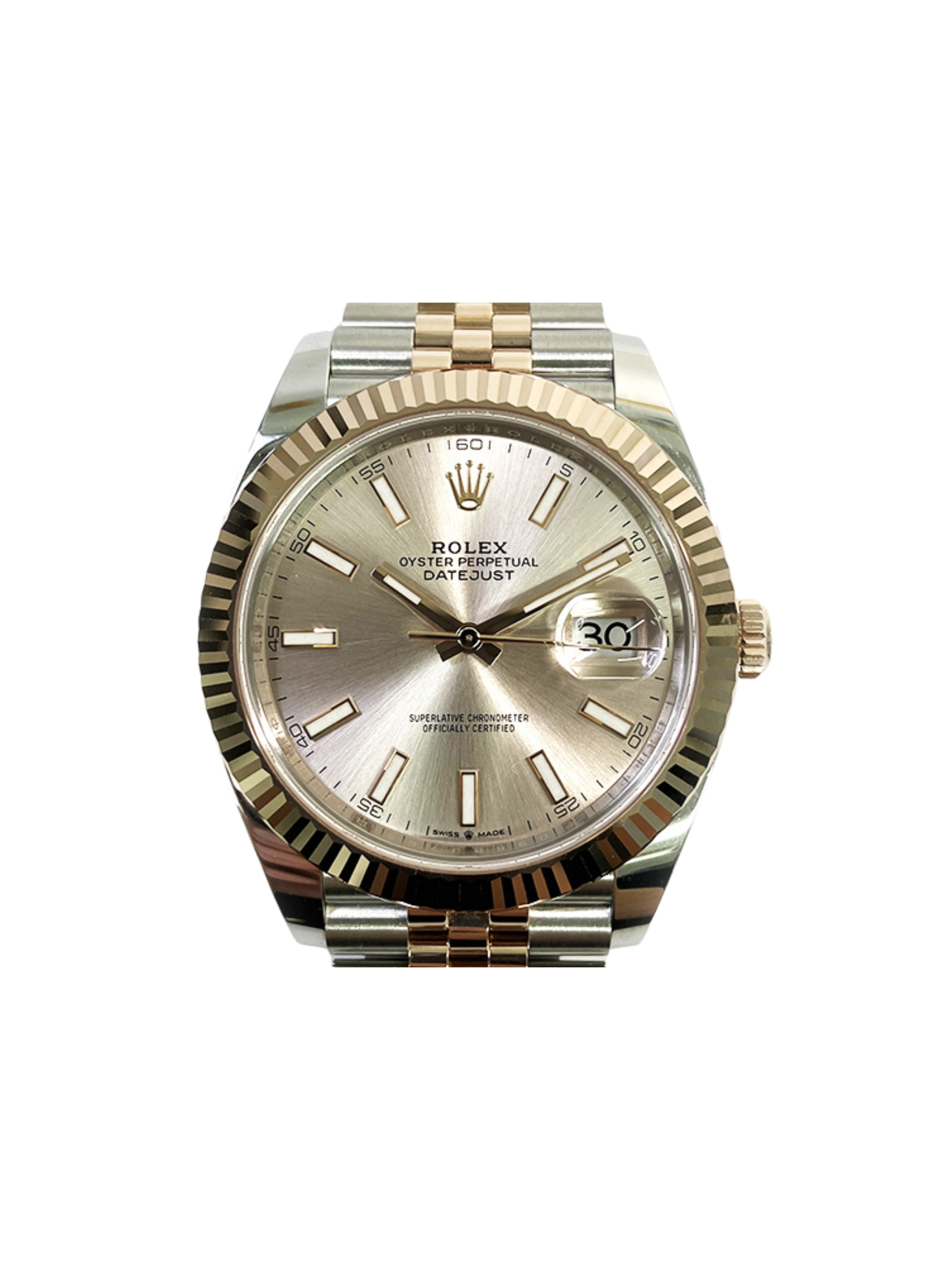 Crafted from Oystersteel and 18k Everose gold, it offers strength with a warm, luxurious finish. The 41mm case has a bold presence on the wrist. The fluted bezel in Everose gold adds a classic Rolex signature.