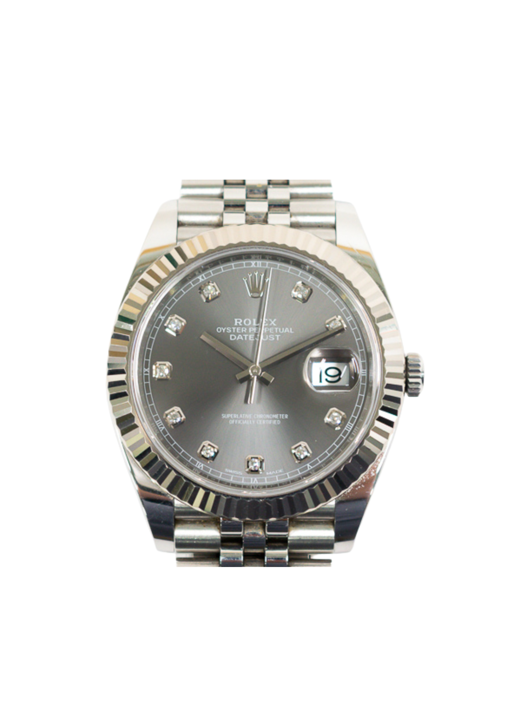 This reference features a 41mm case crafted from durable Oystersteel and elegant 18k white gold. The fluted white gold bezel adds brilliance while reflecting Rolex’s signature design language. Its slate dial offers a contemporary, understated tone that elevates versatility. Diamond hour markers introduce refined sparkle without overwhelming the dial’s clean aesthetic.