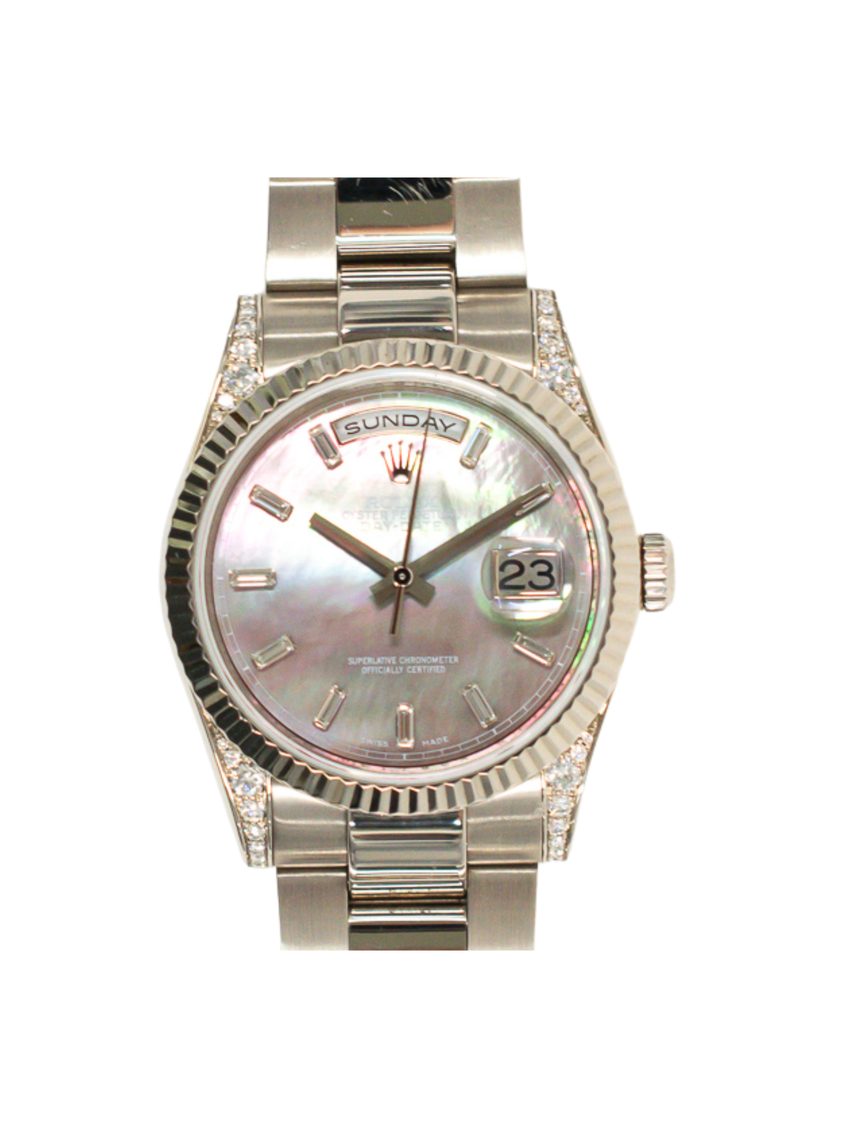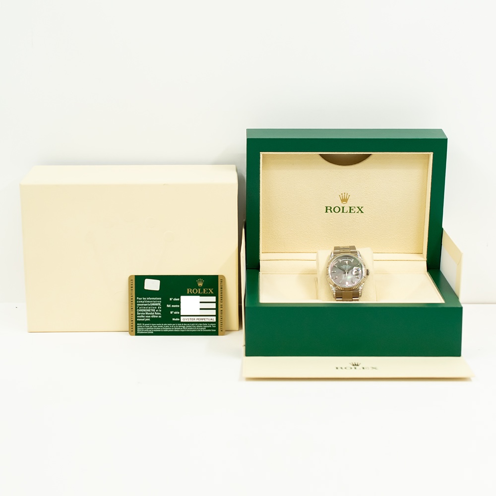 The watch houses the reliable Caliber 3155 movement. It provides a dual display for the day and date, adding both function and heritage. The fluted white gold bezel adds a signature design touch that collectors admire. The President bracelet completes the look with exceptional comfort and elegance.