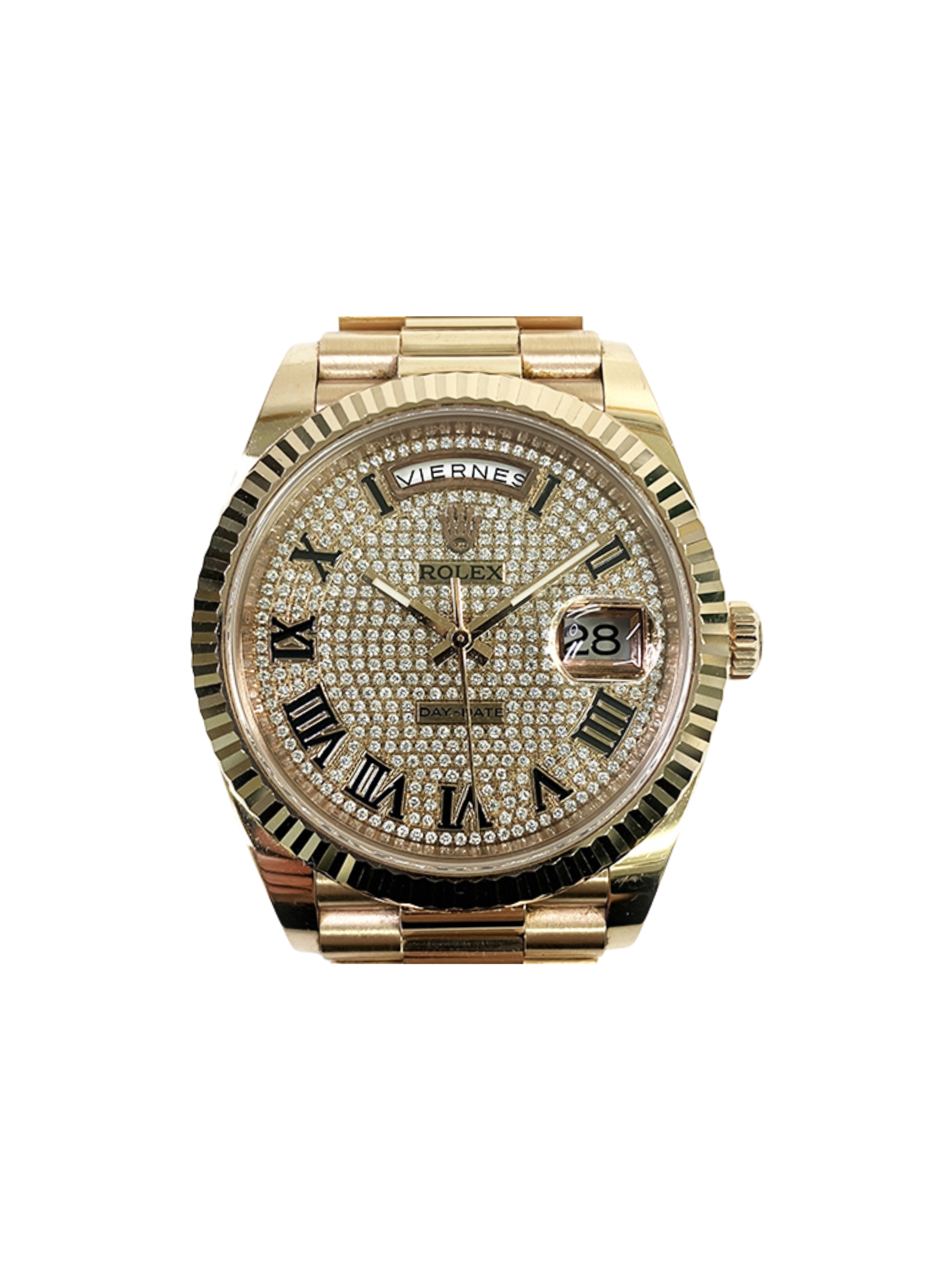 The Rolex Day-Date 40 Rose Gold Pavé Diamond Dial 228235 represents the pinnacle of Rolex luxury and prestige. From the first glance, it commands attention with its brilliance and unmistakable presence. Moreover, it stands as one of the most opulent expressions of the iconic Day-Date collection.