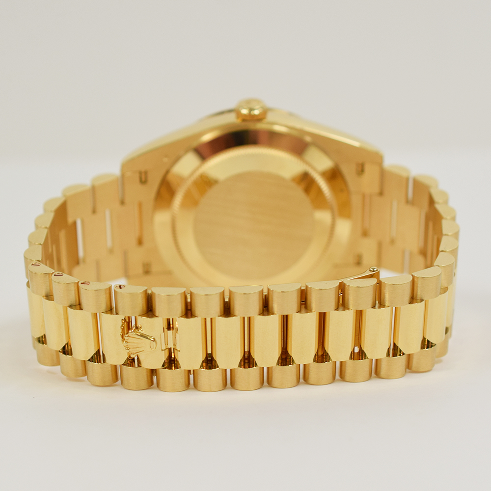 First, the watch features a 40 mm Oyster case crafted from 18k yellow gold. This precious metal delivers rich color and strong presence on the wrist. In addition, the polished surfaces highlight the watch’s refined design. The iconic President bracelet, created specifically for the Day-Date line, adds comfort and unmistakable prestige.