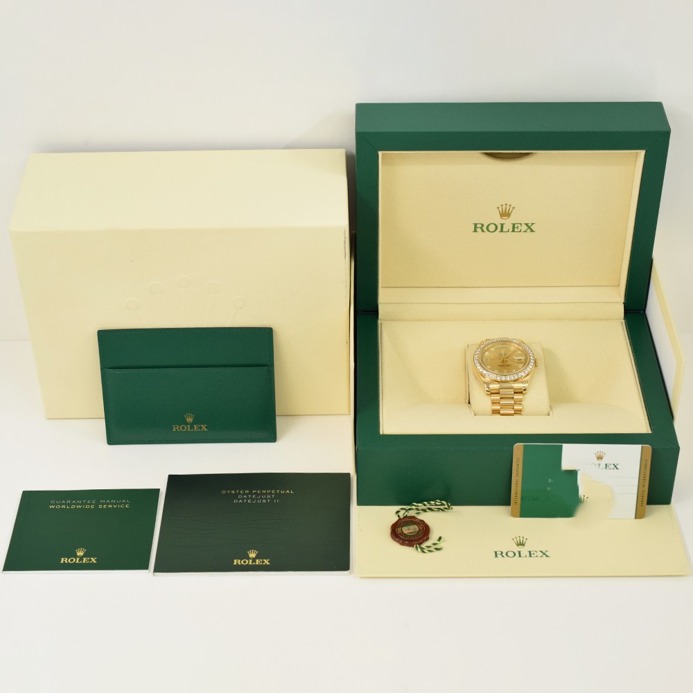 The Rolex Day-Date II Yellow Gold and Champagne Diamond Dial 218348A runs on a precise automatic movement. It delivers reliable accuracy and smooth performance. The President bracelet also adds comfort and a refined, secure fit.