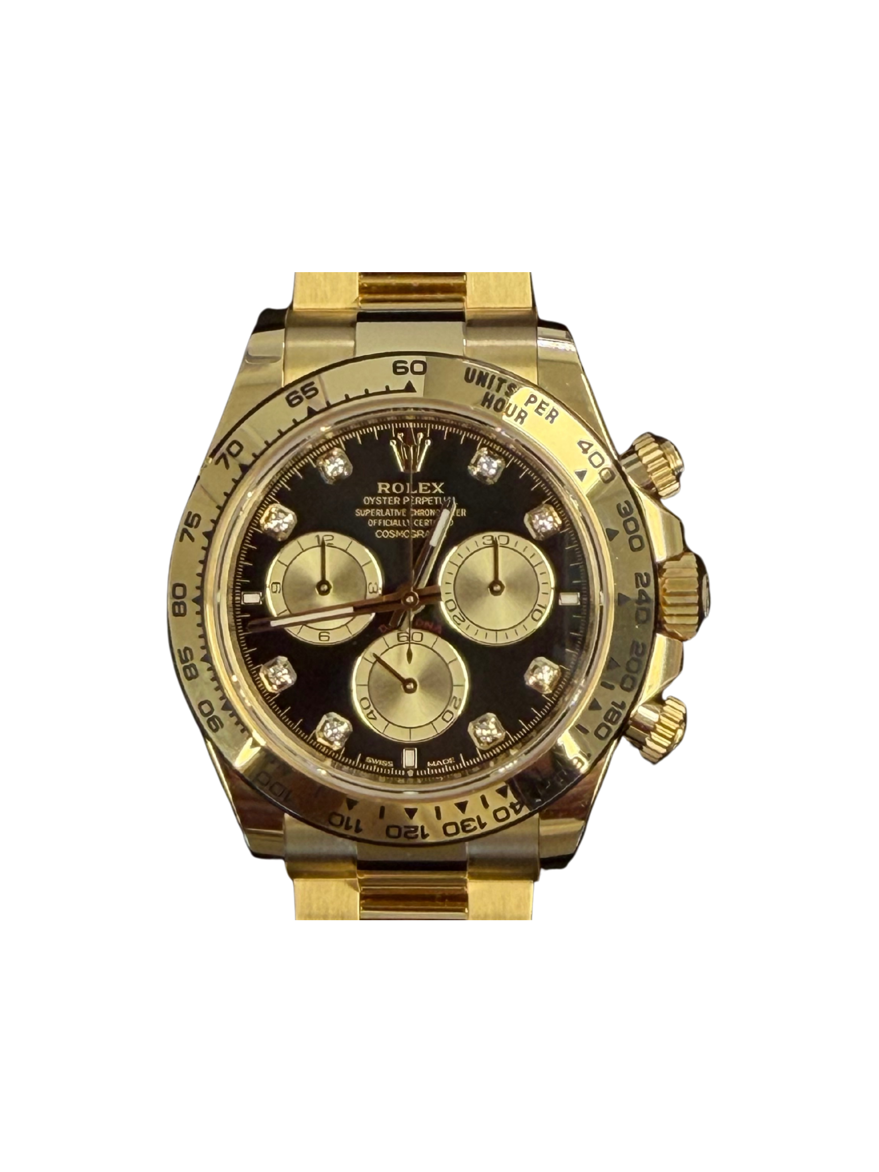 The Rolex Daytona Cosmograph Yellow Gold with a Black Diamond Dial represents the pinnacle of luxury chronographs. Crafted entirely from 18k yellow gold, this model delivers bold presence and unmistakable prestige. Its 40mm Oyster case balances classic proportions with modern refinement.