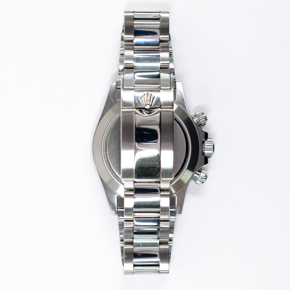 The watch features a 40mm Oystersteel case that offers durability and a clean, powerful look. The black dial provides sharp contrast for the three sub-dials, which track elapsed time with impressive clarity. Its steel bezel includes an engraved tachymetric scale that highlights the Daytona’s racing heritage. These details create a bold yet elegant aesthetic.