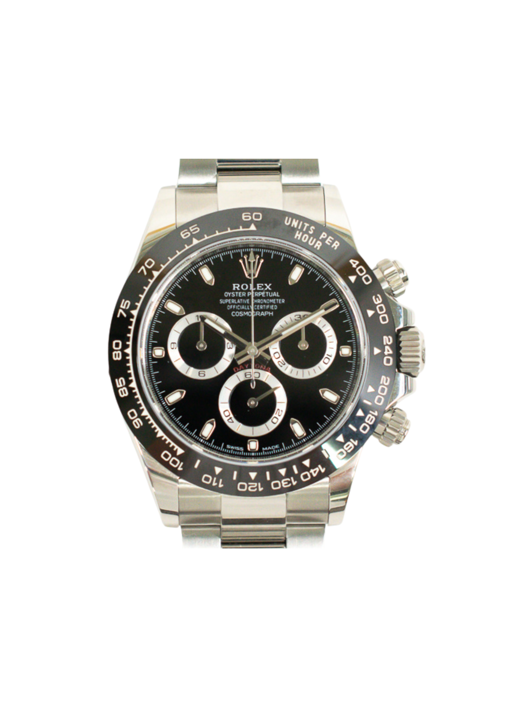 Crafted from robust 904L Oystersteel, the watch offers unmatched durability while maintaining a polished, luxurious finish. Its black Cerachrom ceramic bezel is highly scratch-resistant, providing enduring elegance and precise tachymetric functionality for measuring speed.