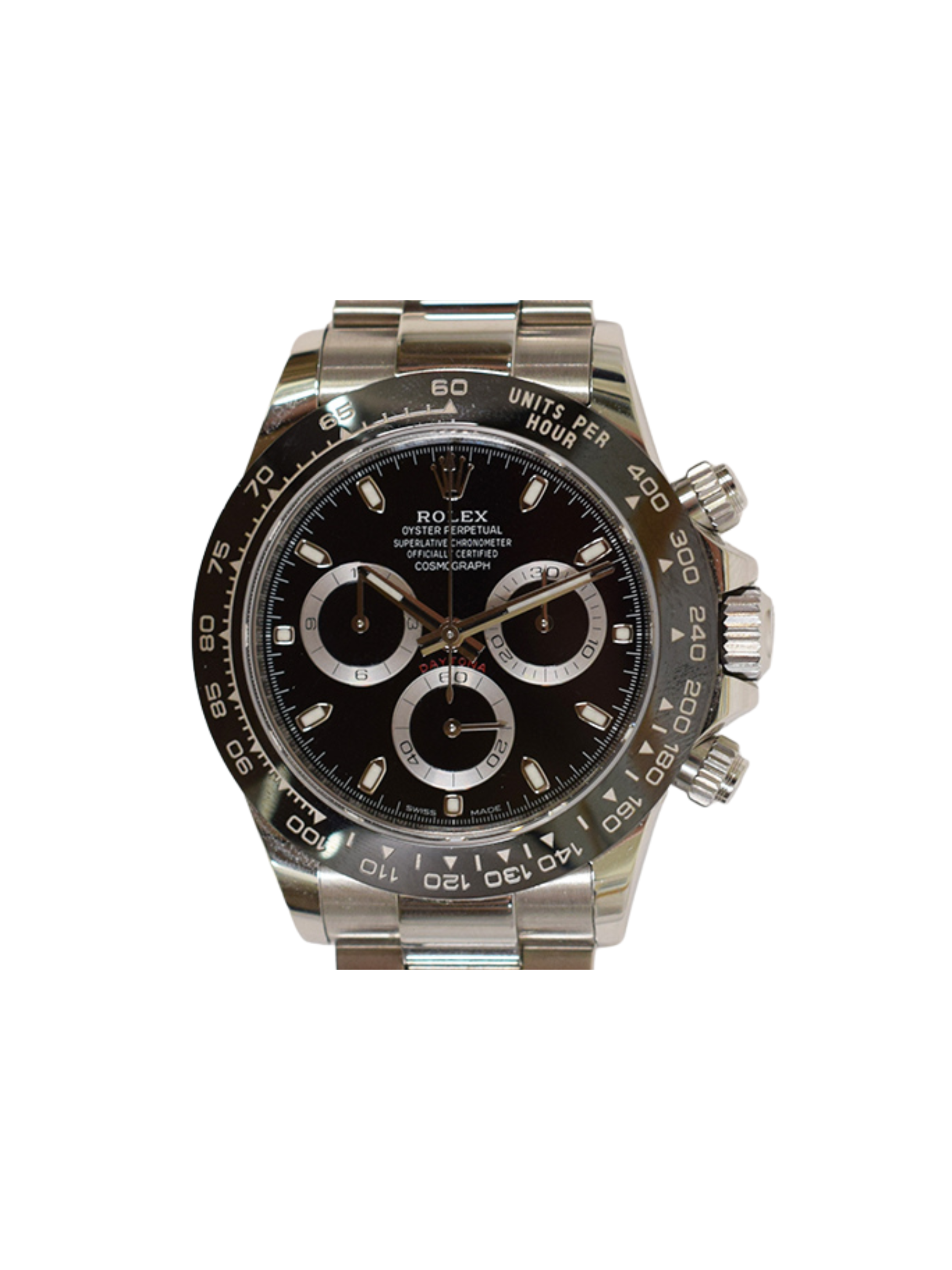 Finally, the Oyster bracelet provides comfort and durability with its brushed and polished links. The Oysterlock clasp ensures a secure fit on the wrist. Overall, the Daytona 116500LN combines iconic design, precise chronograph function, and modern materials, making it a top choice for collectors seeking a high-performance timepiece.