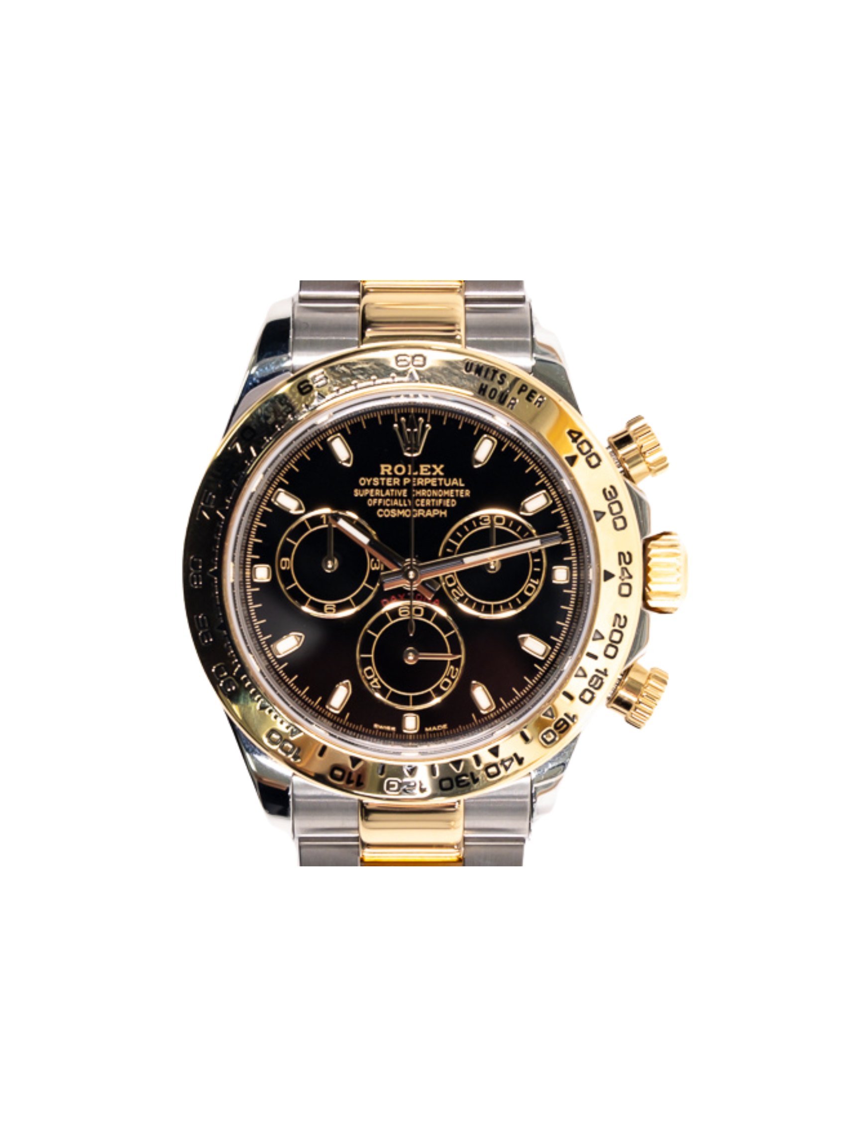 The Rolex Daytona Stainless Steel Yellow Gold with Black Dial is an iconic chronograph celebrated worldwide for its precision and style. Crafted from a combination of Oystersteel and 18k yellow gold, this timepiece perfectly balances durability and luxury. Its black dial, enhanced with luminous hands and hour markers, ensures exceptional legibility in all lighting conditions. The chronograph functions are controlled via screw-down pushers, allowing accurate timing of events.