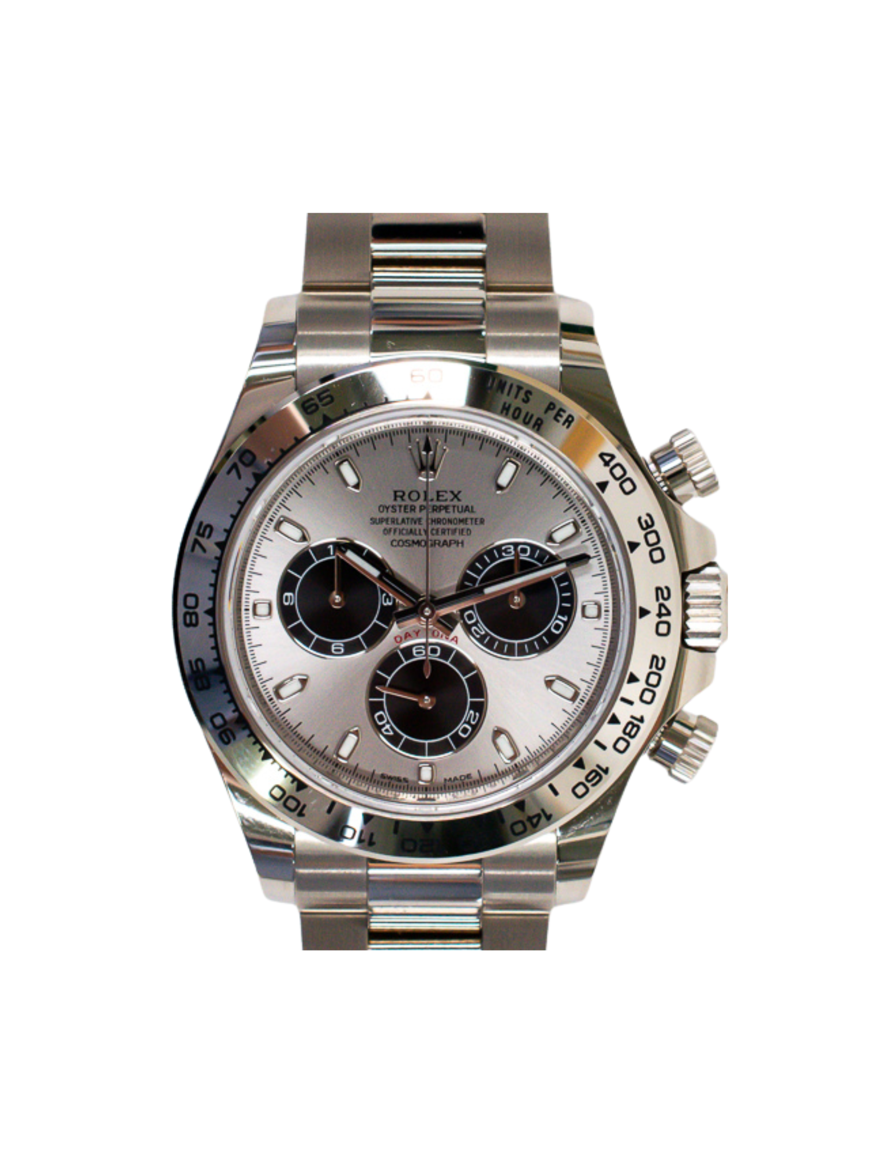 The Rolex Daytona White Gold with a Steel Dial stands as one of the most refined expressions of Rolex’s racing heritage. This model blends precious metal luxury with a streamlined, modern aesthetic. Its 18k white gold case delivers exceptional presence while maintaining a clean and contemporary look. The solid gold Oyster bracelet reinforces its premium feel and ensures long-lasting comfort.